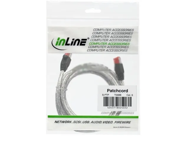 Category Cat.6 twisted pair network cable for connecting network components with RJ45 connections, such as switches, routers, sockets, patch panels and network cards. Suitable for Gigabit connections (1Gbps) at a maximum frequency of 250Mhz.InLine Patch Cable S/FTP PiMF Cat.6 250MHz PVC copper transparent 1m. Cable length: 1 m, Cable standard: Cat6, Cable shielding: S/FTP (S-STP), Connector 1: RJ-45, Connector 2: RJ-45, Product colour: Transparent