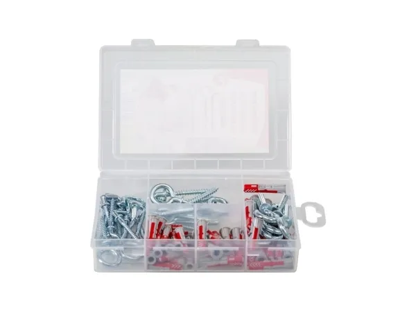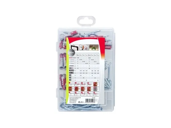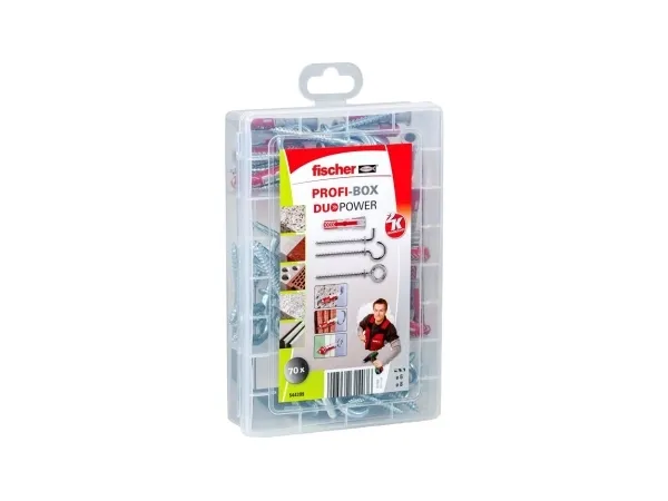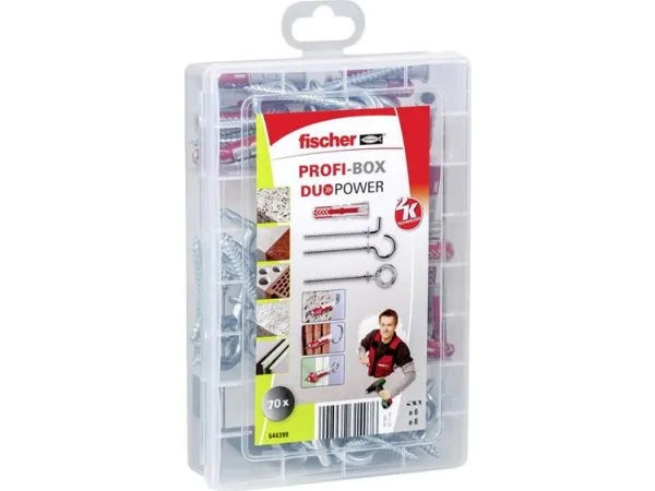 PROFI-BOKS DUOPOWER + KROG fischer MEISTER-BOX i slagfast plast af høj kvalitet er ideal for værksteder og byggepladser og tilbyder et optimalt pris-/ydelsesforhold. Den praktiske installationsboks indeholder et udvalgt udvalg af stik, skruer og kroge til de mest almindelige anvendelser og byggematerialer. Samspillet mellem ideal-komponenter garanterer altid valget af en sikker fastgørelsesløsning. Takket være det gennemsigtige låg og rummene kan indholdet ses på et øjeblik. Dette sparer tid og garanterer valg af egnede fastgørelseselementer. fischer MEISTER-BOX kan genanvendes.