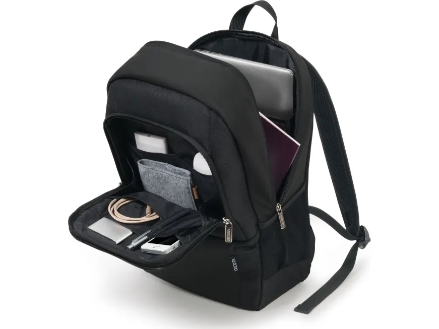 This compact backpack offers ideal protection for laptops thanks to its high-density foam (HDF) padding. Its lightweight design guarantees flexible mobility. The spacious main section is divided so that documents and accessories can be stored separately. The front pocket has practical smaller compartments so you can organize smaller items like your smartphone, pens or chargers. There is space for your water bottle or umbrella in the easily accessible mesh side pockets.