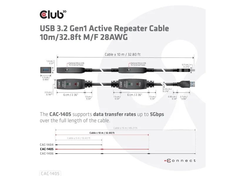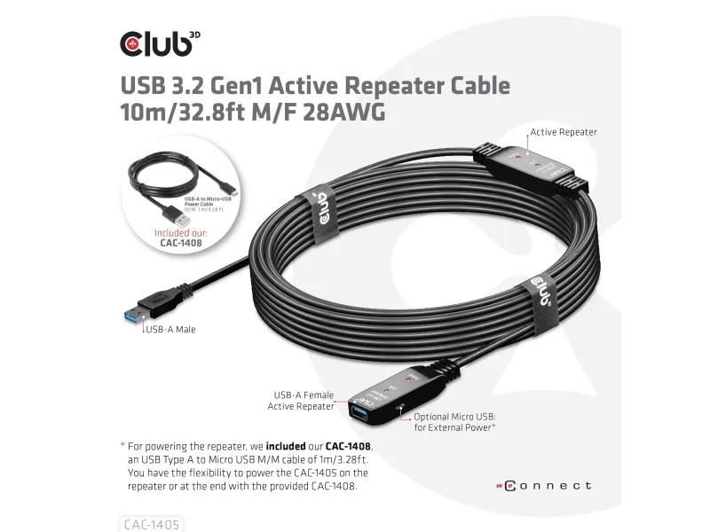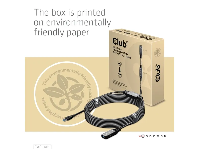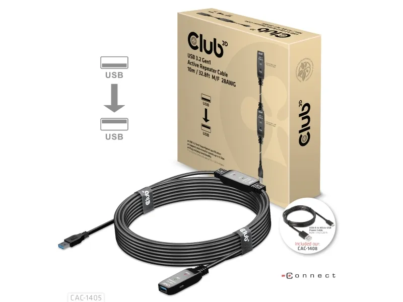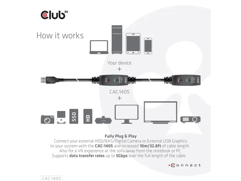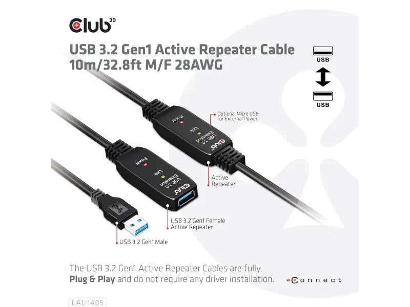 With this Club3D USB 3.2 Gen1 Active Repeater Cable, you can go far beyond the standard USB Cable length limitation of 3 meters /9.84 feet, without loss of data transfer speed. The USB 3.2 Gen1 active repeater cables are fully Plug & Play and do not require any driver installation. Just connect your external USB device like external HDD/NAS/digital camera or external USB graphics to your system with the CAC-1405 and have flexibility of the increased 10 meters of extra cable length. Also for a VR experience at the sofa away from the notebook or PC this cable provides you with the freedom of movement. The CAC-1405 supports data transfer rates up to 5Gbps over the full length of the cable.