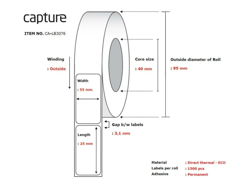 Capture CA-LB3076 termotransferetiketter er en praktisk løsning for ulike behov for merking. Med en mediestørrelse på 55 x 25 mm og et permanent klebemiddel sikrer disse etikettene holdbarhet og brukervennlighet for alle dine utskriftsbehov. Hver rull inneholder 1 500 etiketter, noe som gjør dem til et kostnadseffektivt valg for utskriftsoppgaver med store volumer. Disse etikettene er utformet for å passe inn i vanlige etikettskrivere og egner seg for frakt, organisering og andre merkeaktiviteter.