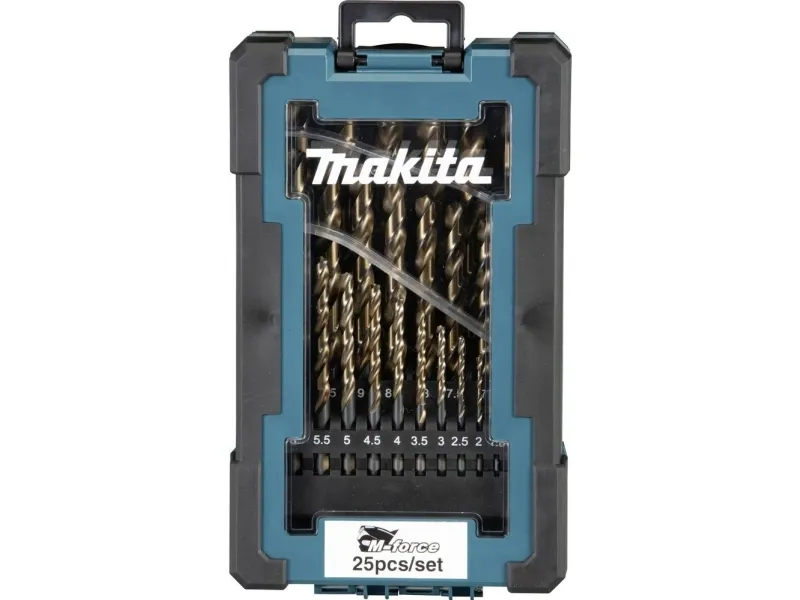 Makita bor-sæt M-Force, 25 dele D-67599 M-Force-borene har en særdeles hurtig og ren boring takket være den specielt udviklede dobbeltskær M-Force-borspids. Sættet indeholder 25 M-Force-bor i størrelserne 1, 1.5, 2, 2.5, 3, 3.5, 4, 4.5, 5, 5.5 6, 6.5, 7, 7.5, 8 8.5, 9, 9.5, 10, 10.5 11, 11.5, 12, 12.5, 13 mm.