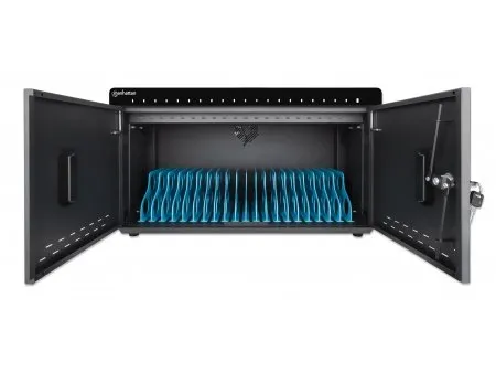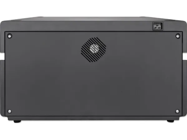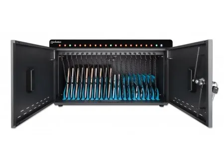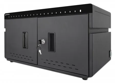 Keep your devices organized in the 20 bays with 264 (D) x 22 (W) x 235 (H) mm / 10.39 x 0.87 x 9.25 in. each. Use the cable management built into the dividers to structure your charging cables (available from Manhattan). As this Desktop Charging Cabinet features USB-C ports instead of AC outlets, you do not need additional wall chargers. The AC input on the back is a C20 connector that lets you replace the included power cable with other cables based on your region.