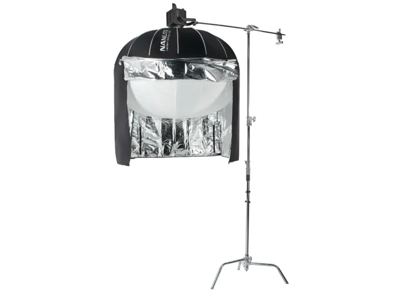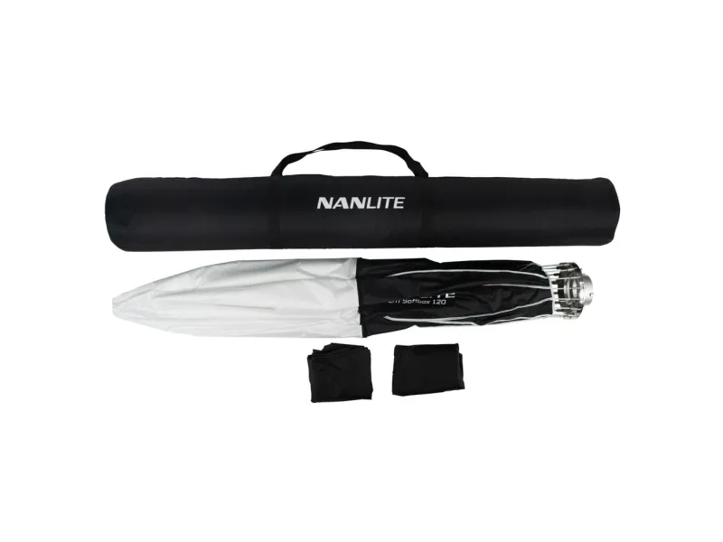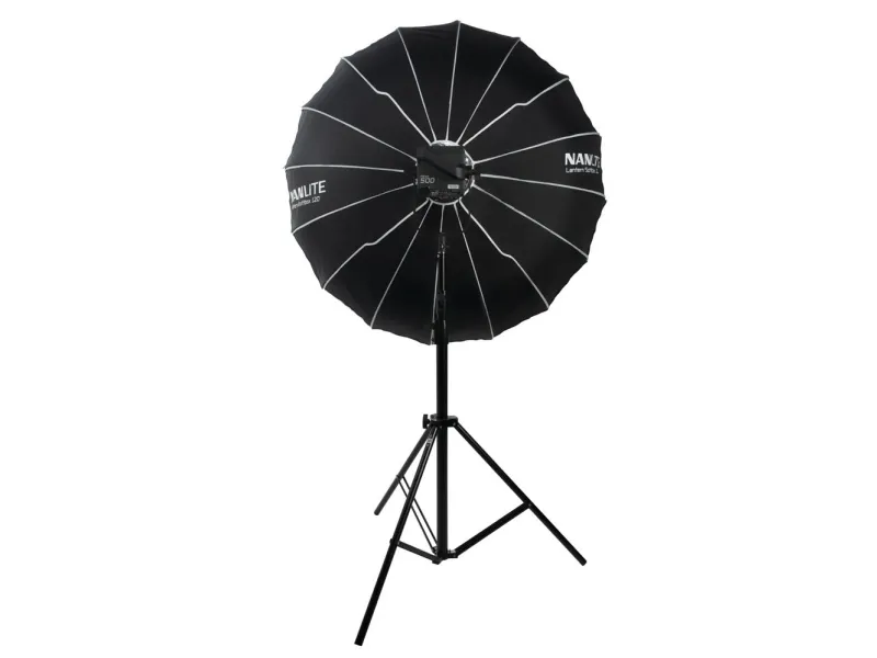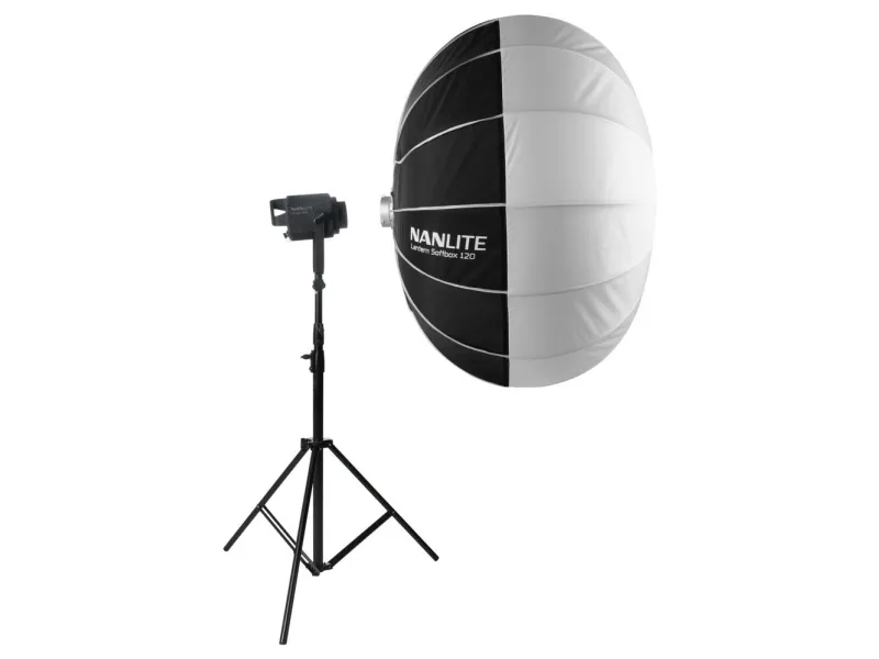 The Nanlite Lantern 120 Easy-Up Softbox with Bowens Mount (47in). Ideal for use overhead or to raise the ambient illumination level, it combines the omnidirectional light quality of "China Balls" with the durability and portability of a modern softbox. Includes light control skirt set and carry bag.