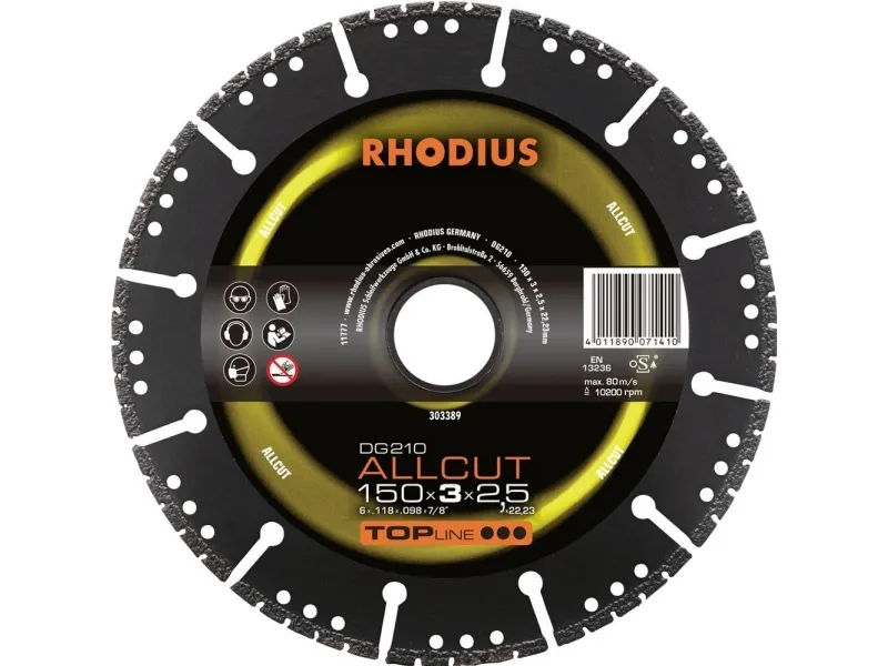 RHODIUS DG210 ALLCUT, diamantskæreskive 150 x 3,0 x 2,5 x 22,23 mm, lige, Topline, til universel anvendelse Med DG210 ALLCUT holder brugeren en ægte universalskive i hånden. Den imponerer med en konstant skæreevne i mange forskellige materialer.