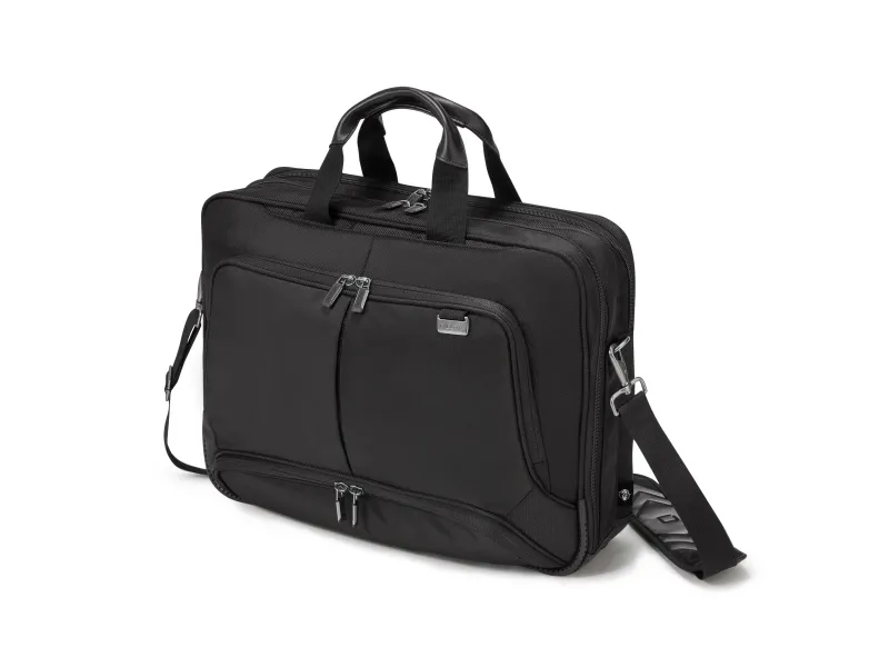 Travel 1st class with the Eco Top Traveller PRO. The top loader bag reliably accompanies you everywhere and meets the highest standards of quality, functionality and protection: DICOTA's attention to detail makes this bag one of your most reliable business partners! The fit-all system separating wall in the notebook compartment lies protectively across your notebook and fits automatically to sizes from 15-17.3". The perforated and thus light EVA foam material in the lockable notebook compartment perfectly protects the edges of your device. The anti-slip technology coating ensures perfect grip for your notebook in the compartment. Excellent protection for your tablet up to 12.9" thanks to the EVA-shaped compartment with extra-soft Nylex inner lining. Generous storage space for documents. The front pocket with keychain and insert pockets allows you to organize the personal equipment and provides space for additional mobile accessories. Additional pocket for charger and cables. The bag is light and comfortable in your hand thanks to the high-quality genuine leather handles. The trolley strap can also be used as an additional document compartment. The bag bottom is made of waterproof material. The Eco Top Traveller PRO is therefore perfect for you if you are always on the go and want to support the recycling of PET bottles with an eco-friendly case.