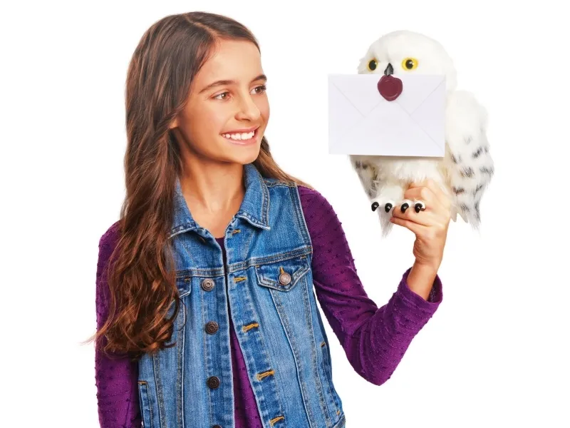 Recreate your favorite Harry Potter scenes with the Wizarding World Enchanting Hedwig. Featuring over 15 realistic sounds and movements and super soft plush material, Enchanting Hedwig brings the iconic Harry Potter owl to life. Remove Hedwig from her perch and discover all of her magical features. Hedwig loves to be pet. With “ruffle detection,” she can sense which way you are petting her. For loving chirps and head movements, pet her from front to back – she doesn’t like having her feathers ruffled backwards and will let you know how she feels about it. Place your finger in her beak and she’ll playfully nibble on it when she’s happy. Enchanting Hedwig also recognizes your tone of voice. When you speak soft and gently, she’ll respond with a hoot to show you that she is listening. If you speak too loudly, she’ll respond with some loud sounds of her own. Set Hedwig back on her perch and write a special message to a friend. Slide your note into the Hogwarts envelope and help Hedwig deliver it. She holds the envelope in her mouth and will only happily release it to the right person with a secret interactive code – stroke her head three times and Hedwig will let go of the envelope. Pet Hedwig and comb her to continue to keep her happy. Then, deliver a new message and play again and again. With so many exciting features, this 9-inch Enchanting Hedwig owl toy will inspire your imagination through fun and exciting pretend play. This interactive Hedwig plush owl is a must-have Harry Potter gift for ages 5 and up. Bring home your very own Wizarding World Enchanting Hedwig and experience the magic of Harry Potter.