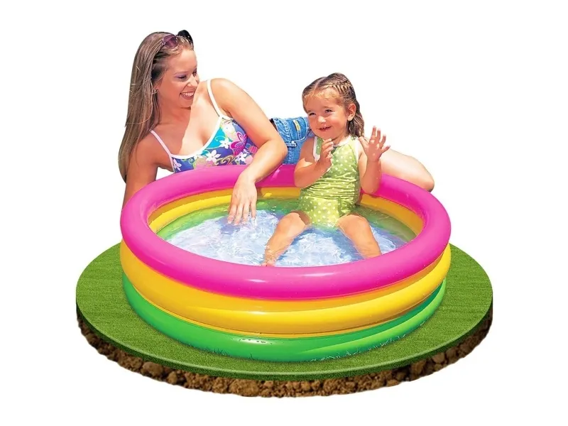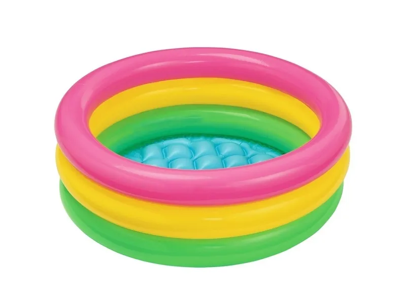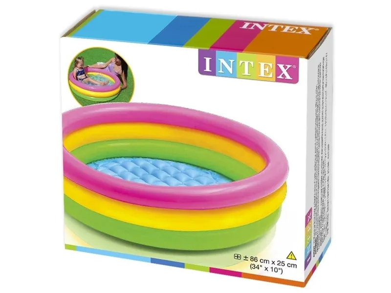 Fargerikt og med myk bunn er dette bassenget et flott sted for de minste. Den perfekte måten å tilbringe en varm sommerdag på. Dette INTEX-bassenget består av tre ringer i forskjellige farger, og en myk oppblåsbar bunn. Inkl. 1 basseng, 86 x 25 cm OG med en kapasitet på 56 liter, og 1 lapp. Fra 1-3 år, men under oppsyn av en voksen.