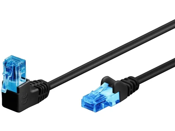 kobberbeklædt aluminiumleder (CCA), snaplås på toppen Kabellængde Samlet, uskærmet LAN-kabel med 2x RJ45-stik til tilslutning af netværkskomponenter 1x 90° vinklet RJ45-stik er en ideel løsning på trange steder. Snaplåsbeskyttelsen af den lige RJ45-stikledning forhindrer, at den snaplås kan hænge fast eller brække af, hvilket sikrer en pålidelig internetforbindelse. Højkvalitets, kobberbeklædt aluminiumleder (CCA) og forgyldte kontaktflader garanterer en fremragende, højtydende netværksforbindelse. Bøjningsbeskyttelse og stabil kappe beskytter Ethernet-kablet optimalt mod brud på kablet. CAT-kablets længdeangivelse er markeret på den overstøbte, slanke bøjningsbeskyttelsesmuffe på det lige stik. CAT-6A-netværkskabel er egnet til Power over Ethernet (PoE, PoE+).