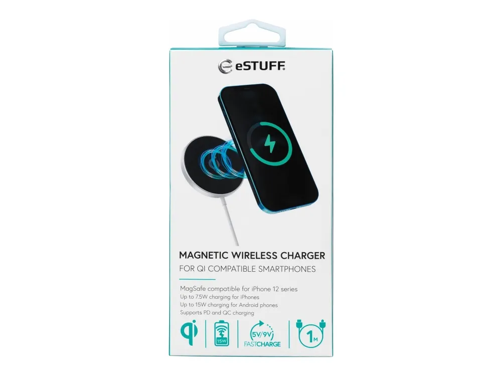 eSTUFF - Trådløs ladematte - 15 watt - 3 A - PD 3.0, QC 3.0 (magnetisk) - hvit, aluminium - for Apple iPhone 12, 12 mini, 12 Pro, 12 Pro Max