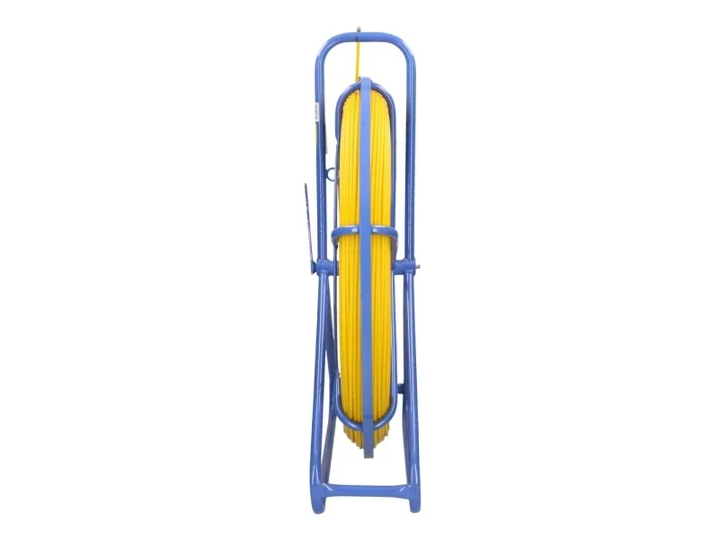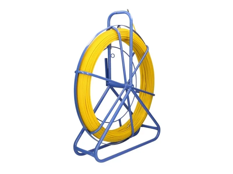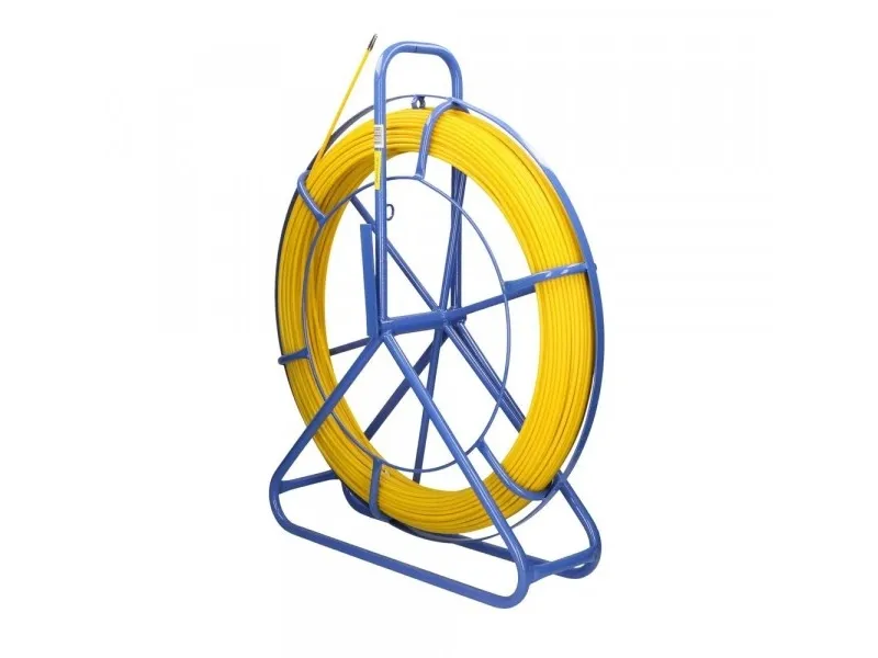 The Extralink cable pulling pilot is a tool with a diameter of 6 mm and a length of 100 meters, made of FRP fiberglass. It is placed on a special stand that facilitates its unwinding. The fiber is characterized by high elasticity and resistance to bending and tearing. Additionally, it is covered with yellow PE plastic, which serves a protective function and provides good sliding properties. The fiber stand is powder-coated in blue and equipped with a manual brake to lock the drum and a special "eye" for guiding the fiber. The design of the stand ensures functional transport, storage, and comfortable use. The end of the fiber is finished with a guiding head.