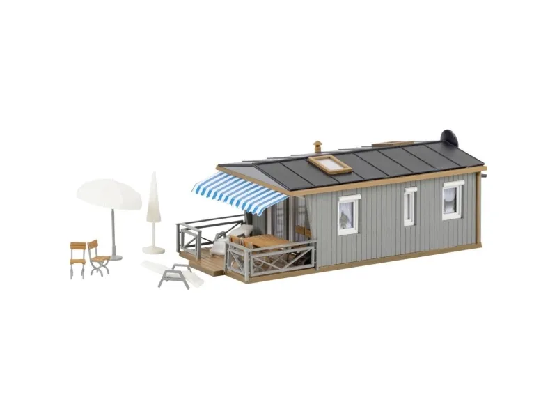 H0 mobilhome Mobil arkitektur! En transportabel boligenhed med veranda, markise og sadeltag med tagvinduer til fremvisning af en campingpladsscene. Passende tilbehør, som f.eks. solskærme, ligestole og et bord med havestole medfølger modellen.