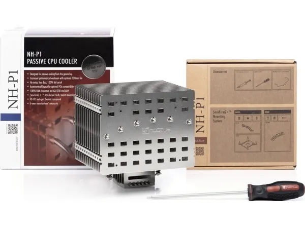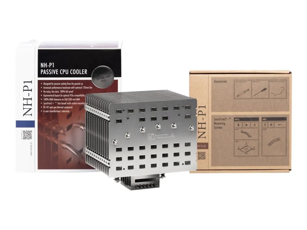 The NH-P1 is Noctua's first passive CPU cooler and has been custom-designed for fanless operation from the ground up: in enclosures with good natural convection, its six heatpipes and thick, widely spaced heatsink fins enable it to cool modern high-end CPUs with low to moderate heat dissipation completely passively. For further enhanced performance or semi-passive setups that only spin up their fans when necessary, the NH-P1 can be outfitted with a low-speed, ultra-quiet 120mm fan.