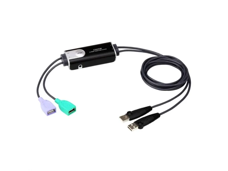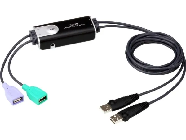 The ATEN CS62KM is a 2-port USB Cable KM Switch that enables users to control up to 2 computers with a single keyboard and mouse. The CS62KM offers various innovative port selection methods for users to switch between the connected computers via remote port selector, keyboard hotkey, mouse cursor, and mouse wheel. The mouse cursor method adopts ATEN’s exclusive Boundless Switching technology, which provides an intuitive way to switch control to another computer by simply moving your mouse cursor across a screen border and onto the target computer display without limitations.