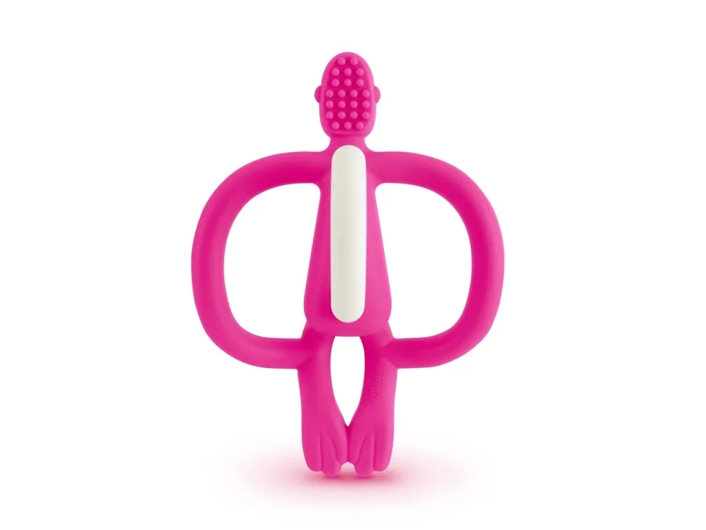 Pink abe-bidering som har små buler til at træne tandbørstning og massere gummerne. Tåler opvaskemaskine og fryser. Alder 3 mdr.