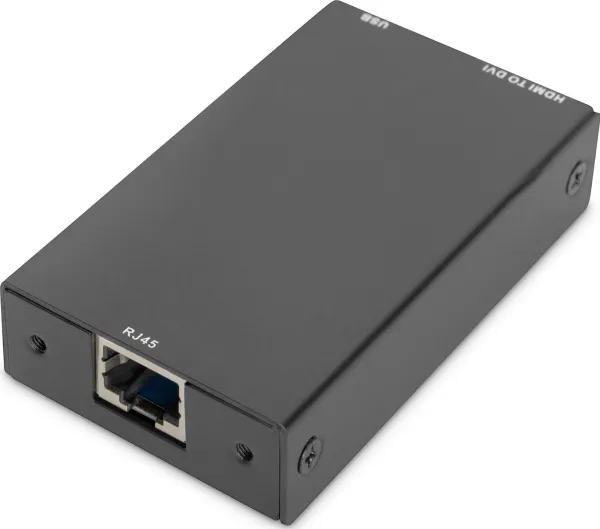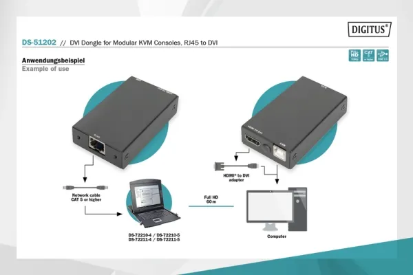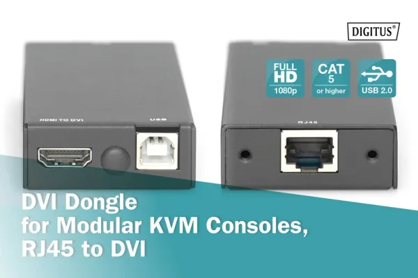 The DIGITUS DVI dongle for modular KVM consoles enables the remote control of a target computer via a single network cable in categories 5, 5e, 6, 6A or higher with RJ45 plug. It connects the KVM switch with the USB and DVI jack of the target computer at ranges of up to 60 m in Full HD resolution. Ideal application for inaccessible server or computer systems. Power supply is provided through the USB connection of the connected device. No need for expensive KVM cables, use a single network cables to remotely control the computer of your choice with a DVI connection.