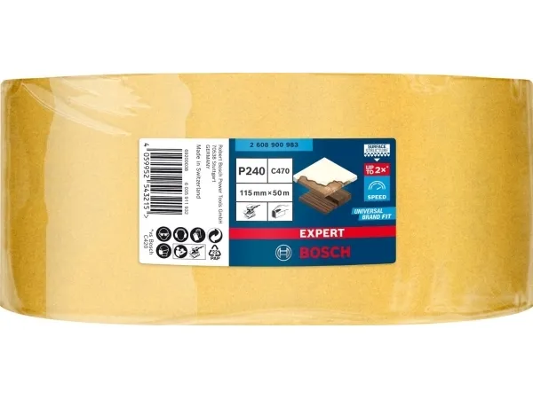 EXPERT C470 slibepapir til håndslibning, 115 mm x 50 m, G 240 Burrelukning Op til 2 gange hurtigere end standard-slibepapir - slibning af store flader er tidskrævende: Mange slibepapirer arbejder hurtigt med støv og mister deres sliversitet, så den egentlige slibeproces behøver mere tid. Ved hjælp af kombinationen af skarpe korn og speciel teknologi, som forhindrer tilstopning, beholder Expert C470 slibepapir sine særlige egenskaber. Det betyder, at du kan arbejde hurtigere og længere uden at skulle gå på kompromis med sliberesultatet. For at opnå den bedst mulige Slibeflade ved vores produktionsmetode tilpasses frøene for at holde dem skarpe oven på dem for at opnå en aggressiv kornopretning. Så dækker vi dem med en stærk binding og en belægning for at forhindre tilstopning. Dette sørger sammen med en optimal korntæthed for maksimal hastighed og minimal tilstopning. Fastsæt mindre tid med slibning og mere arbejde på samme tid – med Bosch Expert C470 sandpapir. Enkel fastgørelse med velcrolukning.