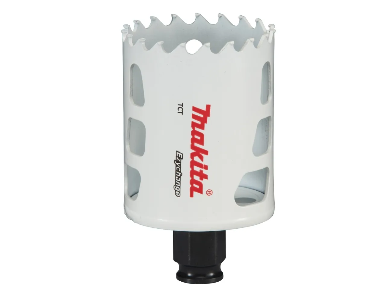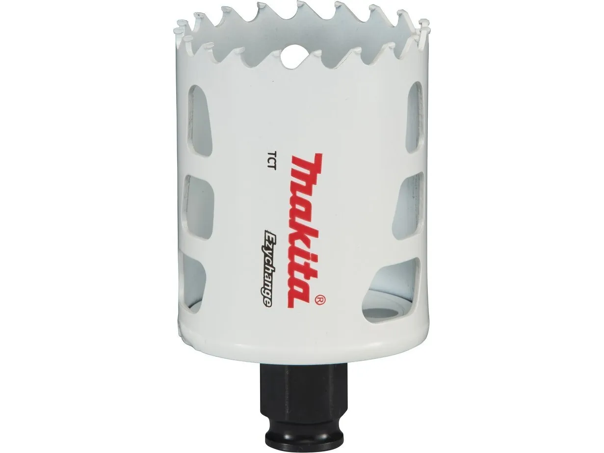 Makita EZYCHANGE TCT-hulsav 54mm E-06731 Den universelt anvendelige hulsav dia. 54 mm med forbedret støvafledning, egner sig ideal til kompositmaterialer. Det garanterer med deres hårdmetalstænder en lang levetid og skærehastighed i sten, stål, rustfrit stål, aluminium, træ og plast op til en skæredybde på 60 mm. Den EZYCHANGE-lynskiftesystem muliggør udskiftning af hulsav uden brug af værktøj.