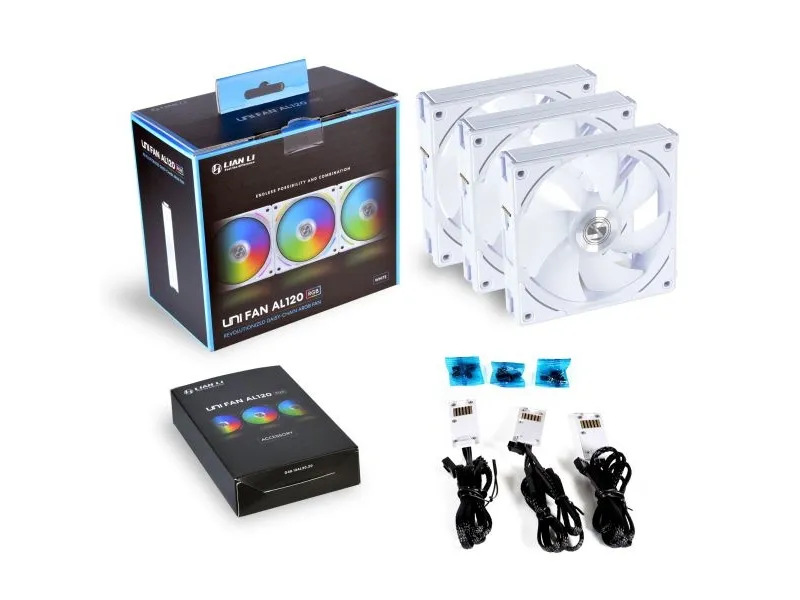 Lian Li UNI FAN AL120 RGB PWM-ventilator, pakke med 3 stk. inkl. controller - 120 mm, ekstra 120-mm-PWM-blæser i hvid I pakke med 3 stk. med UNI HUB-controller