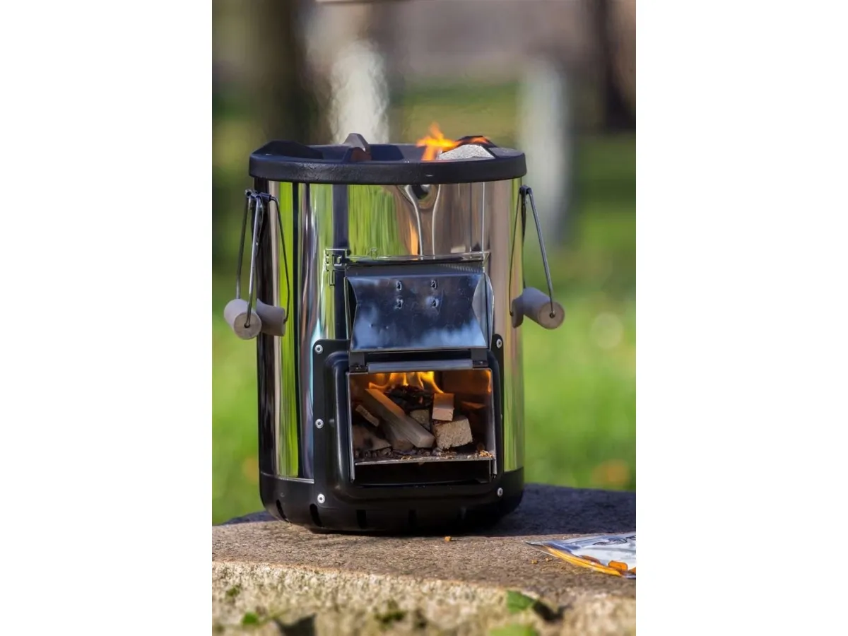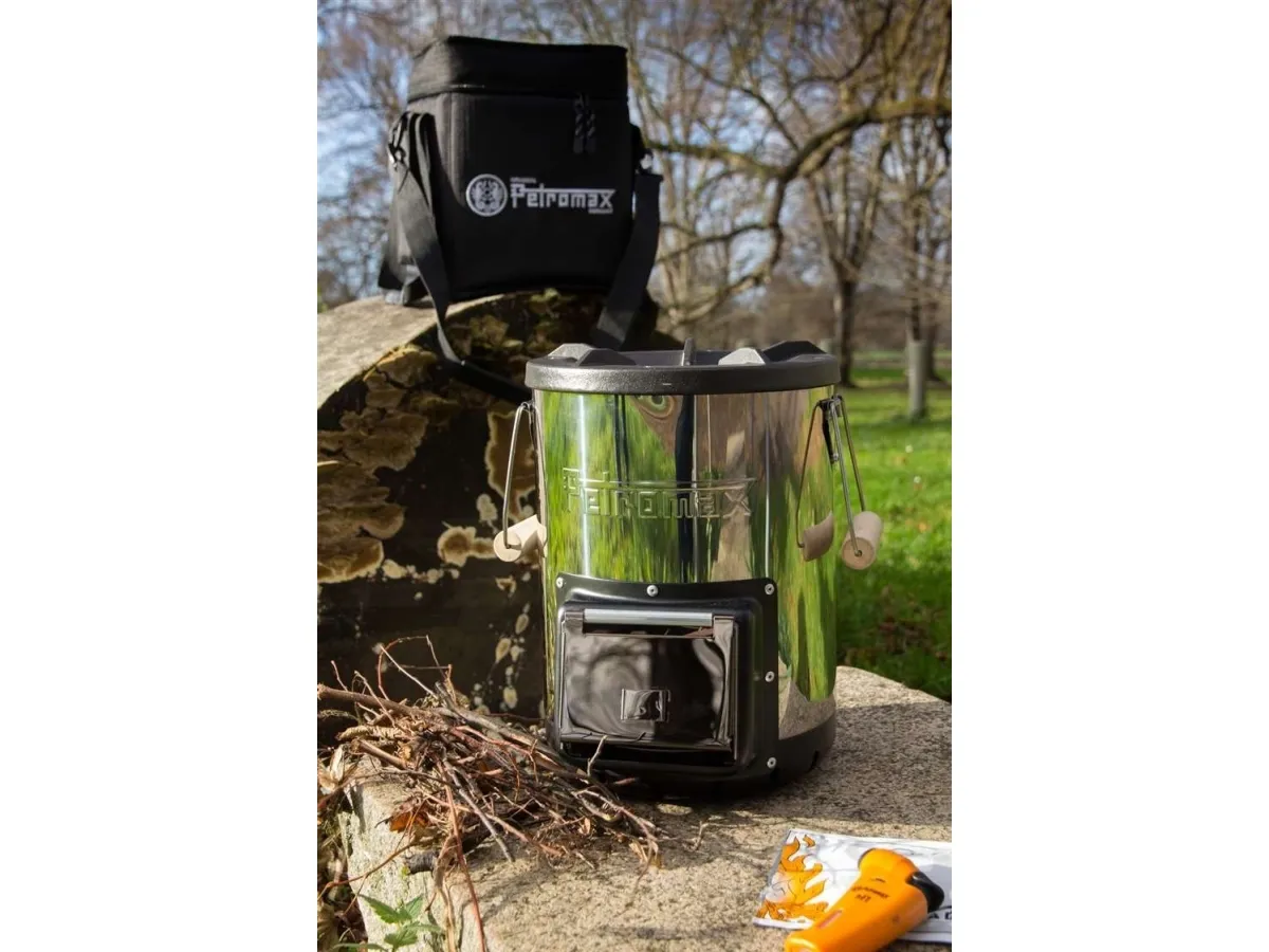 The Petromax Rocket Stove rf33 effectively combines stack effect and wood boiler principle, thus achieving an extremely efficient combustion of biomass thanks to an optimal air supply. The L-shaped design of the fuel support, combustion chamber and chimney vent is crucial. Wood, pine cones and so on can be easily provided through the practical support, so that the fire can be optimally regulated. In the combustion chamber the heat is limited to a small space which is protected by the insulated body. The heat escaping from the vent can thus be stored in the cast-iron top and used to cook. The Rocket Stove rf33 is an addition to outdoor kitchen as a robust stove with economical combustion. It is sturdy, durable and easy to use thanks to its handles.
