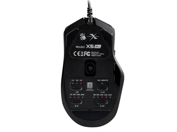 4 Customizable Sensor SensitivityCraft your gaming with the 4 on-board adjustable performance switches, P-CPI, D-CPI, LOD, Setting (Lift Off Distance) and Report Rates. With the performance switches, the mouse can be an extension of you in the game world and effortlessly translate whatever you're doing on your desk to the game with pinpoint precision.Personalized Customizable CPI ButtonClick P-CPI button to cycle through the tuned CPI selection LED parameters. If you wish to tune the parameter, please press and hold P-CPI button for 3s, the indicator LED will flash, scrolling the wheel upward will increase CPI and scrolling downward will decrease CPI. Press P-CPI button to set the desired CPI setting then the LED will become solid. And CPI can be restored as 1000 CPI by pressing the left, middle, right button at the same time for 5s. Your ideal CPI setting will depend on your body measurements, monitor resolution, and physical dexterity. It will take some experimenting to find out the perfect mouse speed for you.3-Manual Adjustable Lift off Distance Setting [LOD]Press the LOD button to cycle switch the lift off distance between 1.5 mm | 2.0 mm | 3.0 mm. Personalized the Lift Off Distance to pair with your surrounding gaming habits. Customize LOD that best provides the accuracy and controllability for you.4-Manual Adjustable Report Rate [R-Hz]Shift between available Report Rates (125, 500, 1000, 2000 Hz) best suitable for your gaming sessions.Texturized Rubber GripsErgonomic sides with rubberized texture grips to help you get a solid hold during intensive gaming sessions.AFC SystemInspired by the design of the lever, split key and bigger right button ensure button function in all position. X5 Max features more comfortable shape, wonderful UV surface, reasonable weight these are perfect for all grips (Palm, Claw, and Tip).RGB Lighting Effects SettingPress the 4th and 5th buttons at the same time, you can switch between 12 RGB lighting effects with the wheel to scroll up and down, the lighting effect will be saved after releasing the buttons.BLOODY X5 Max. Form factor: Ambidextrous. Device interface: USB Type-A, Movement resolution: 10000 DPI, Buttons type: Pressed buttons, Buttons quantity: 4, Scroll type: Wheel, Acceleration (max): 35 G. Illumination colour: Multi. Power source: Cable. Product colour: Black