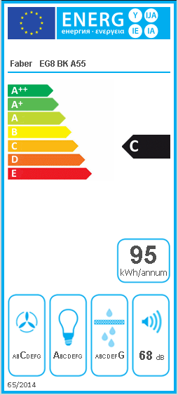 FABER S.p.A. Tweet EV8 LED BK A55. Maximum extraction power: 700 m³/h, Type of extraction: Ducted/Recirculating, Fluid dynamic efficiency class: B. Type: Wall-mounted, Product colour: Black, Control type: Touch. Grease filter type: Aluminium. Bulb power: 2.2 W, Number of bulbs: 2 bulb(s), Bulb type: LED. Annual energy consumption: 74 kWh, Energy efficiency scale: A+++ to D, Connected load: 250 W