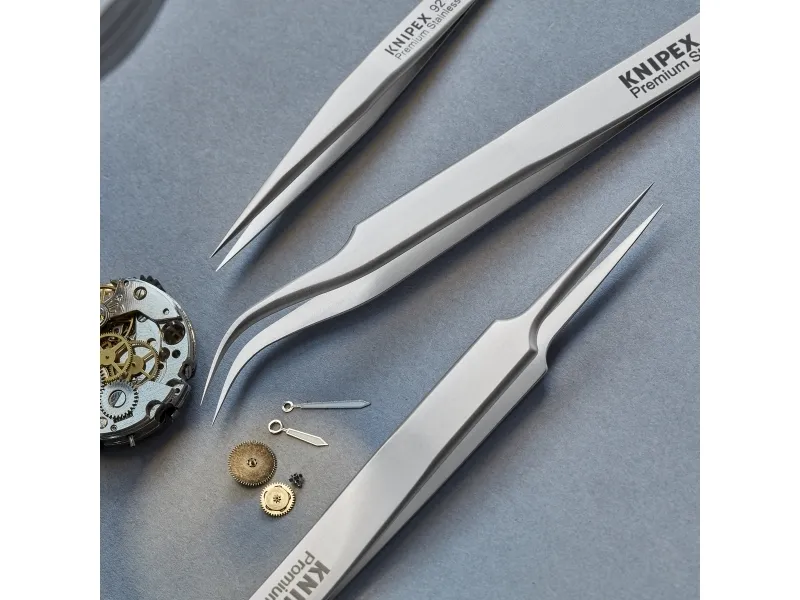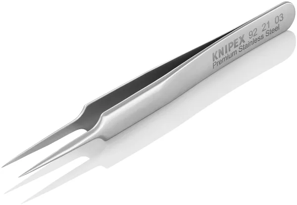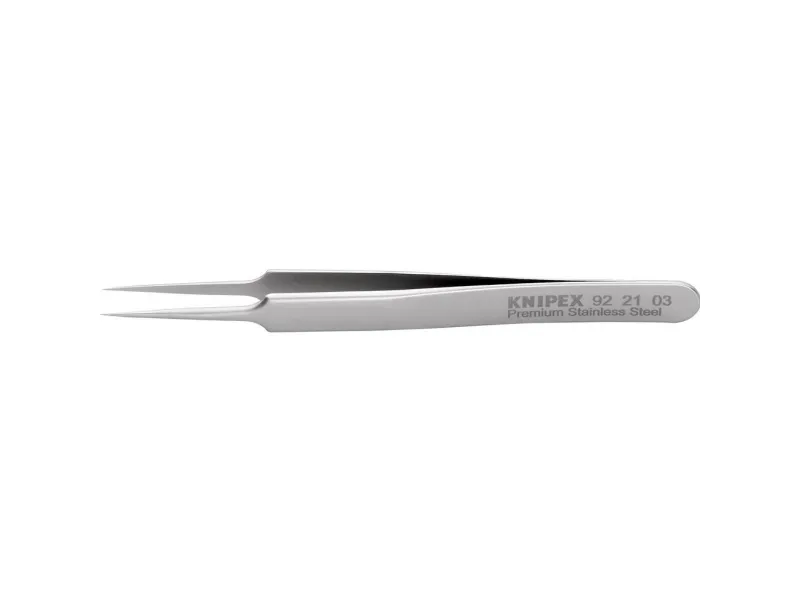 92 21 03 Præcisions-pincet Til særligt krævende præcisionsarbejde: Robust og meget modstandsdygtig over for korrosion. Håndlavet: Med polerede kanter og en fornem mat, ridsefri og ikke-reflekterende overflade. Til elektronikindustrien, urmagere, juvelerer, laboratorier med biologiske og medicinske anvendelser i moderat aggressive kemiske miljøer. Rustfrit stål i højeste kvalitet: Høj temperaturbestandighed og fremragende korrosionsbestandighed over for de fleste kemikalier, salte og syrer. Ideelt egnede til mikroskopi, præcisionshåndtering, reparationer, fremstilling af elektroniske komponenter såvel som andre generelle anvendelser; spidserne har garanteret perfekt symmetri og balance. Fås også som sæt (92 00 02).
