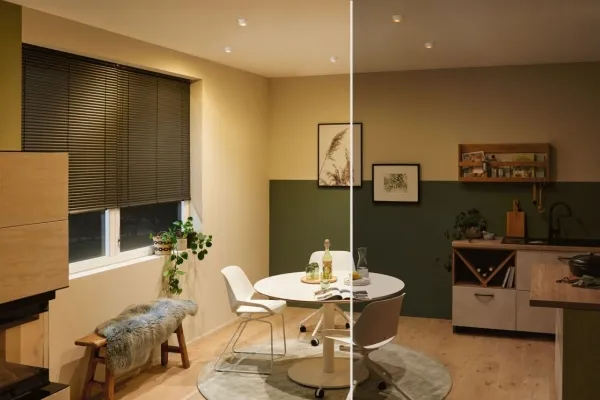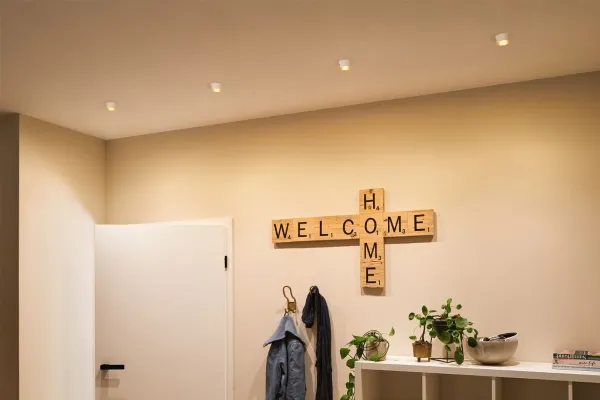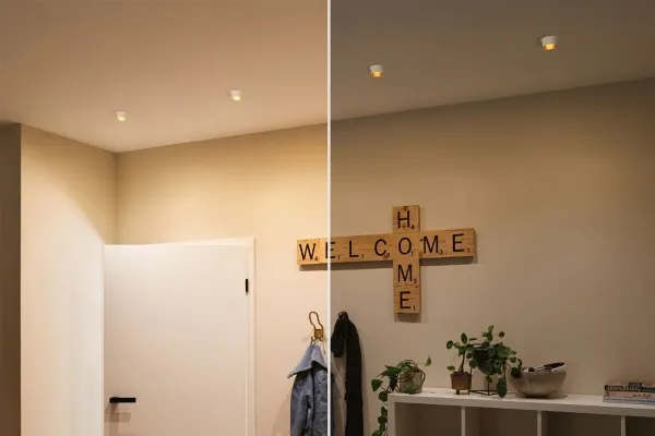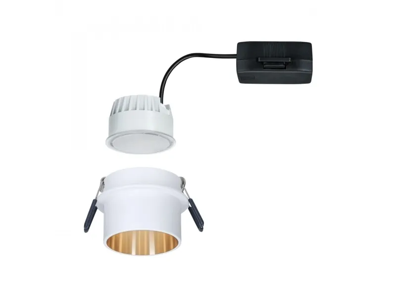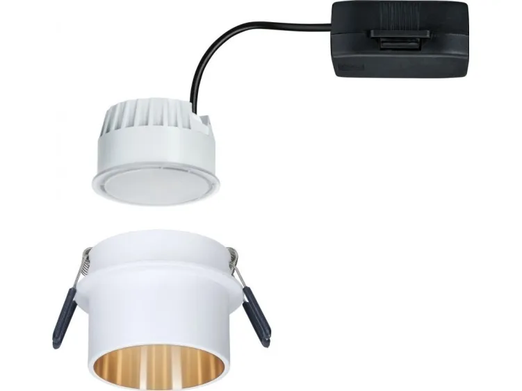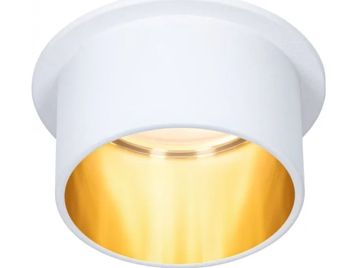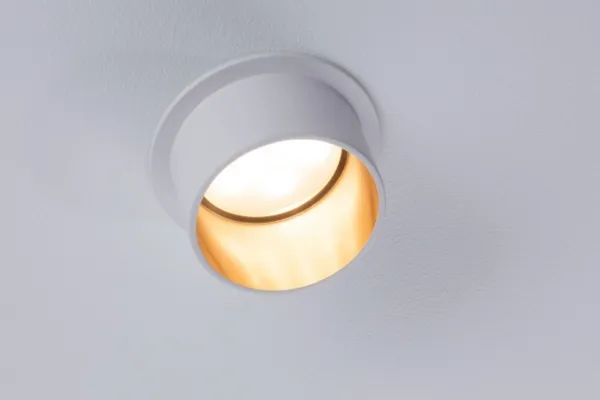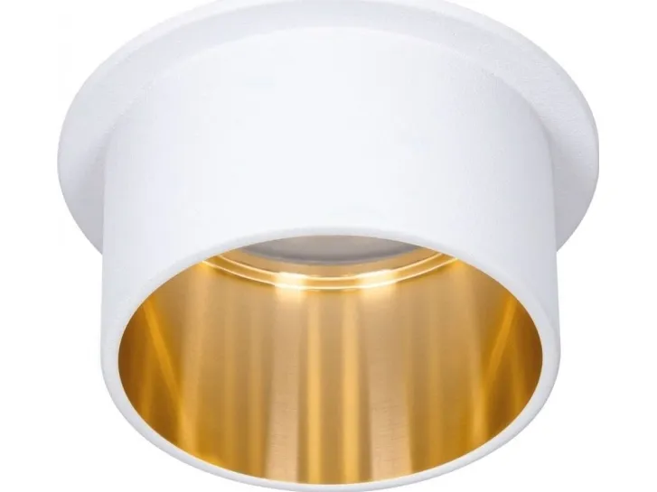 With its two-tone design, the decorative Gil recessed luminaire in Matt white/Gold makes for a real lighting highlight and sets glare-free accents on the ceiling. The protruding decorative cylinder requires a shallower installation depth than the recessed light points. Once you see it, you won’t want to look away The spotlights score points with brilliant technology: The replaceable LED coins provide pleasant warm white light, can be dimmed in three steps using a conventional light switch and can be chained together in an unlimited number. They require a bore of 62 mm.