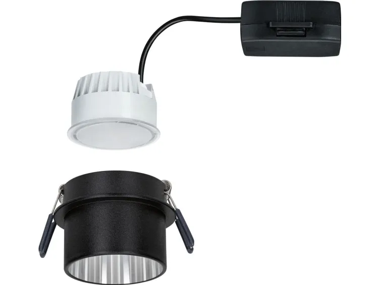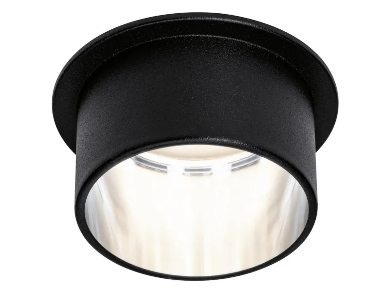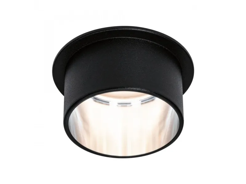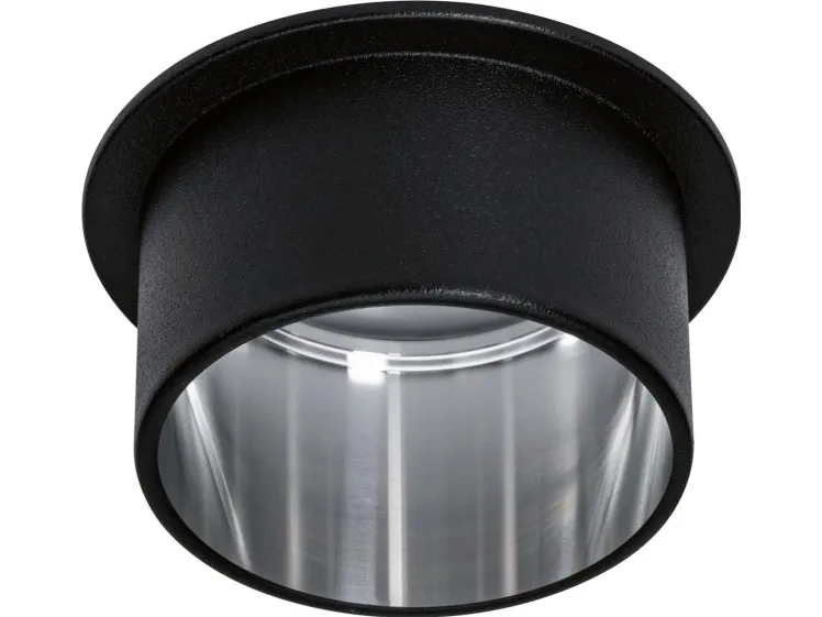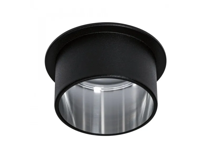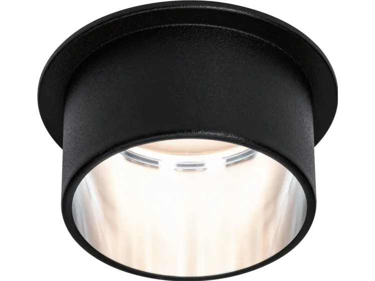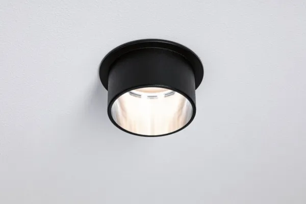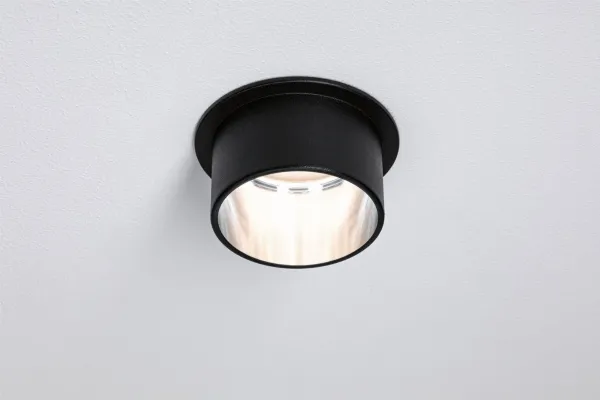 With its two-tone design, the decorative Gil recessed luminaire in Black matt/Brushed iron makes for a real lighting highlight and sets glare-free accents on the ceiling. The protruding decorative cylinder requires a shallower installation depth than the recessed light points. Once you see it, you won’t want to look away The spotlights score points with brilliant technology: The replaceable LED coins provide pleasant warm white light, can be dimmed in three steps using a conventional light switch and can be chained together in an unlimited number. They require a bore of 62 mm.