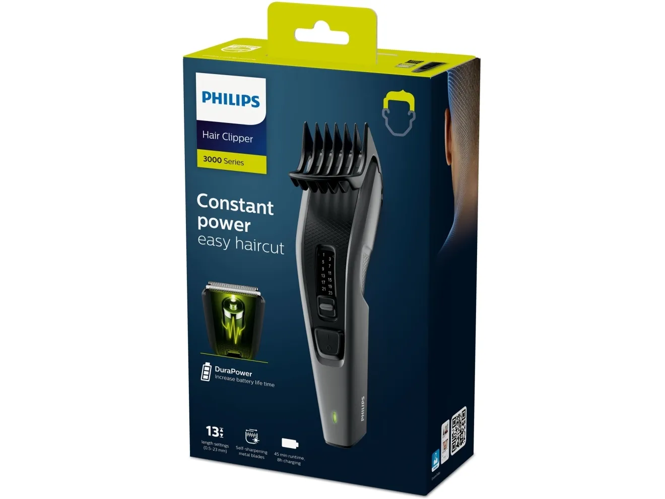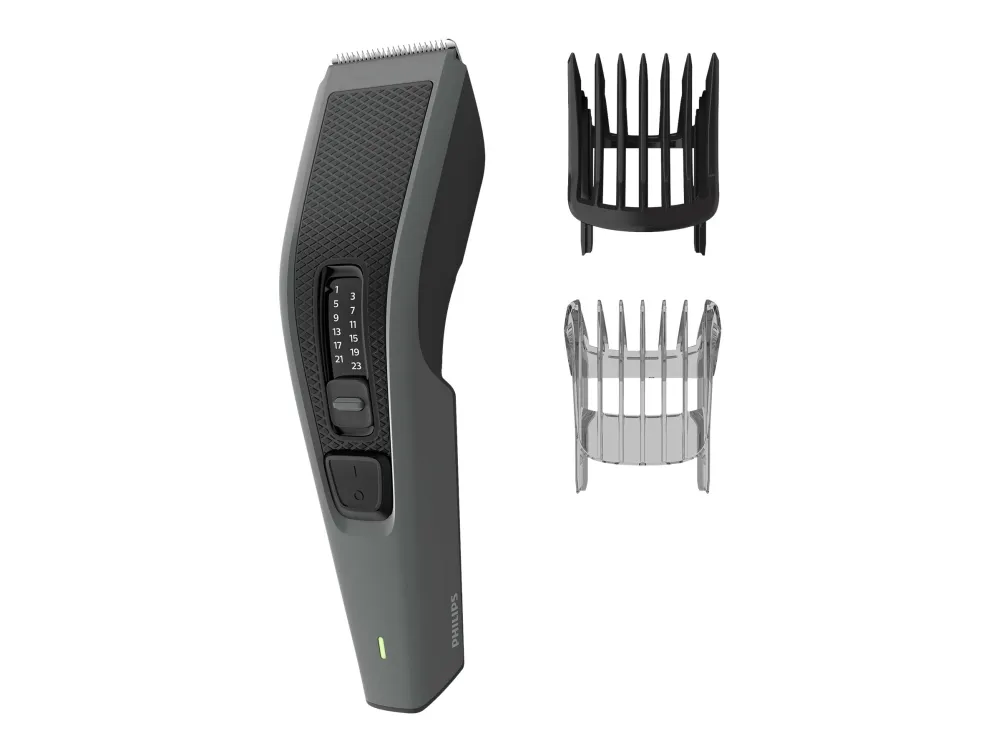 With Hairclipper 3000 you achieve an easy, quick and even haircut, time after time. The DuraPower technology ensures a long-lasting battery performance, while the self-sharpening metal blades remain as sharp as day one without oiling