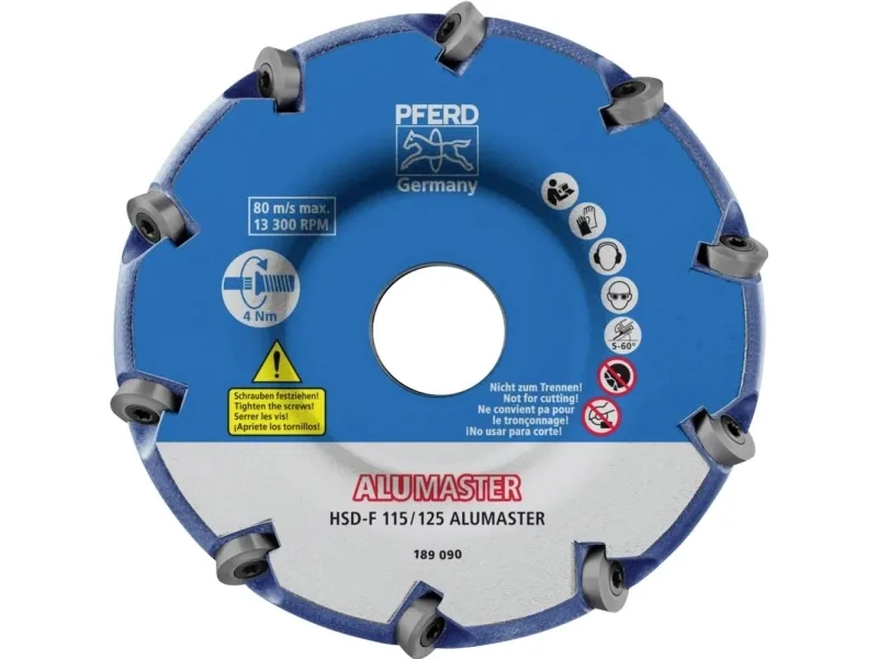Fræseskive Specialværktøj til bearbejdning af særligt krævende aluminiumlegeringer med vinkelsliberen. Vendeskærepladerne har EN HICOAT-belægning.Drevtyper:- Robotter- Vinkelsliber- Batteridrevet vinkelsliberAnvendelser:- Udfræsning- Overfladebearbejdning- Fræsning- Svejsesøm bearbejdning- KødsømbearbejdningMateriale:- Aluminium- Aluminiumlegeringer hårdt- Aluminiumlegeringer blødt- NE metal hård- Bronze- NE metal blød- Kobber- Messing- Zink- Plast- Fiberforstærket duroplaste (GfK, CFK)Fiberforstærket duroplastel (GfK, CFK) fiberandel > = 40%Fiberforstærkede duroplaster (GfK, CFK) fiberindhold over 40 %- Termoplast
