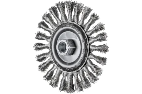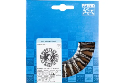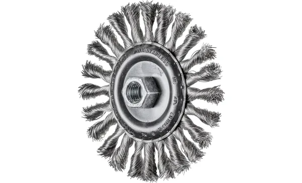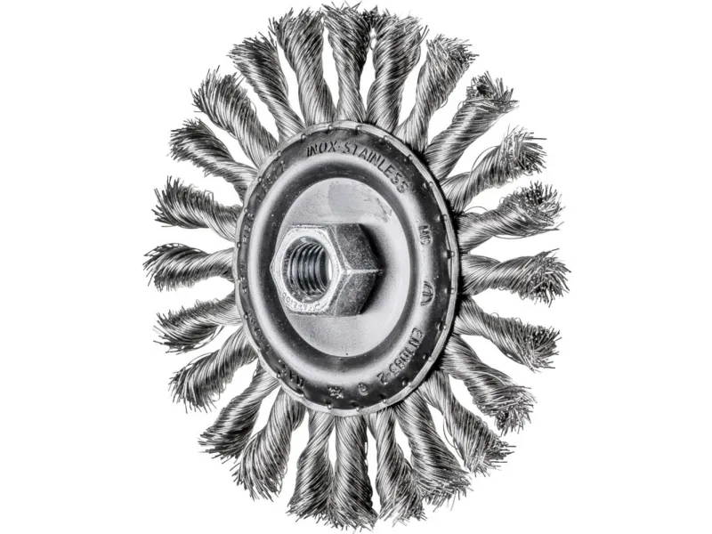 Rundbørste Børste med meget aggressivt arbejde. Egnet til tunge arbejder i metalkonstruktioner som f.eks. udligninger, rustfjernelse, afgratning, pudsning af svejsesømme og fjernelse af limrester.Drevtyper:- VinkelsliberAnvendelser:- Afgratning- RengøringFjern startfarver- Aflak- Rustfjernelse- UdlignendeFjern oxidlag- Svejsesøm bearbejdning- Kødsømbearbejdning- RodsømbearbejdningAnvendelsesanbefaling:Til optimale resultater skal du anvende kraftige vinkelslibere.Materiale:- Aluminium- Andre NE-metaller- Meget Varme materialerCoboltbasegeringerNikkelbaslegeringer (f.eks. B. (Undtagen til brug ved anæstesi)Superlegeringer på nikkel eller titanbasis- NE metal hård- Bronze- TitanTitanlegeringer– Blød titanlegeringer (trækbrudstyrke 500 N/mm²)- Rustfrit stål (INOX)Produktfordele:- Højeste effektivitet på grund af højeste holdbarhed samt materialefjernelse.- Høj arbejdskomfort ved roligt løb uden at tilbageslag med børsten slår til.- Egnet til bearbejdning af hjørner og kanter, da gryden drejer mindre op.