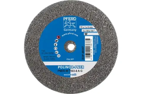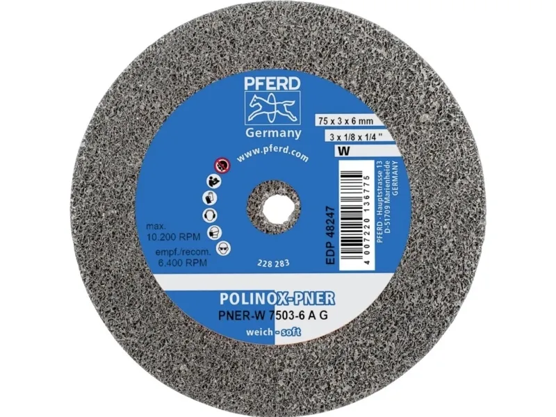 Slibehjul Udførelse til ligesliber, krumningsaksler og slibebukke: Særligt velegnet til bearbejdning af mindre flader. Udførelse til vinkelsliber og håndslibemaskine: Særligt egnet til bearbejdning af kantsømninger og meget svært tilgængelige slidser og fordybninger.Drevtyper:- Krumtapakseldrev- LigesliberAnvendelser:- Ru- Afgratning- Overfladebearbejdning- Rengøring- Struktur (mattering, stregmattering og satinering)- Trinvis finslibningAnvendelsesanbefaling:- Slibehaserne med en diameter på 150 mm kan også anvendes på slibestød for eksempel B. Anvendelse af kirurgiske instrumenter.Materiale:- AluminiumCoboltbasegeringerNikkelbaslegeringer (f.eks. B. (Undtagen til brug ved anæstesi)- Bronze- TitanTitanlegeringer- Kobber- Messing- Zink- Rustfrit stål (INOX)- Termoplast- Fiberforstærket duroplaste (GfK, CFK)- Hærdet, hærdet stål over 1.200 N/mm2 (over 38 HRC)Stålmaterialer med en hårdhed på over 54 HRC- Stål op til 1.200 N/mm2 (< 38 HRC)- Støbestål