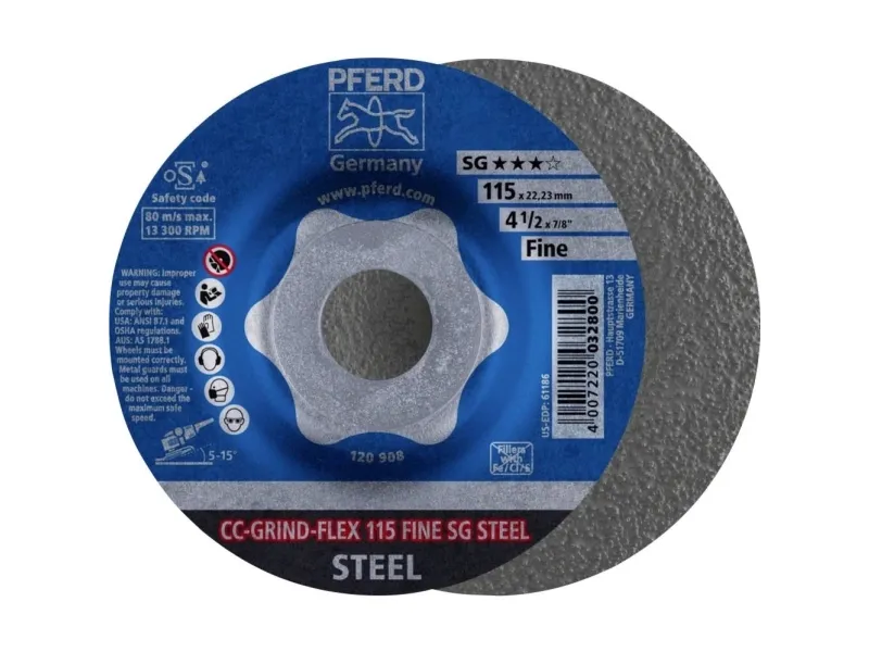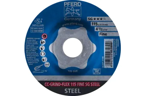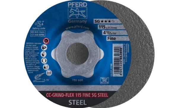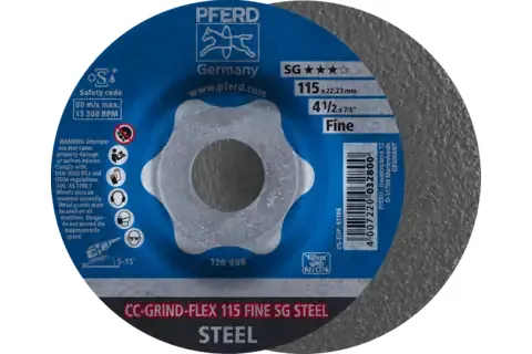 Slibeskive CC-GRind-Flex er det halvfleksible supplement til CC-GRind-SOLID. Den er specielt udviklet til svejsesømme. Stukesvejssvejsninger kan egaliseres komplet plan. Dermed hører hverken buler eller Buckel, som især skal ses efter maling eller lakering, fortiden til.Drevtyper:- VinkelsliberAnvendelser:- Fladeslibning- Svejsesøm bearbejdning- Trinvis finslibningAnvendelsesanbefaling:Indsæt den optimale effekt med flad indstillingsvinkel og spændefflangesæt SFS CC-GRind.- Må kun indsættes med fladen, ikke egnet til periferien.Materiale:- Stål