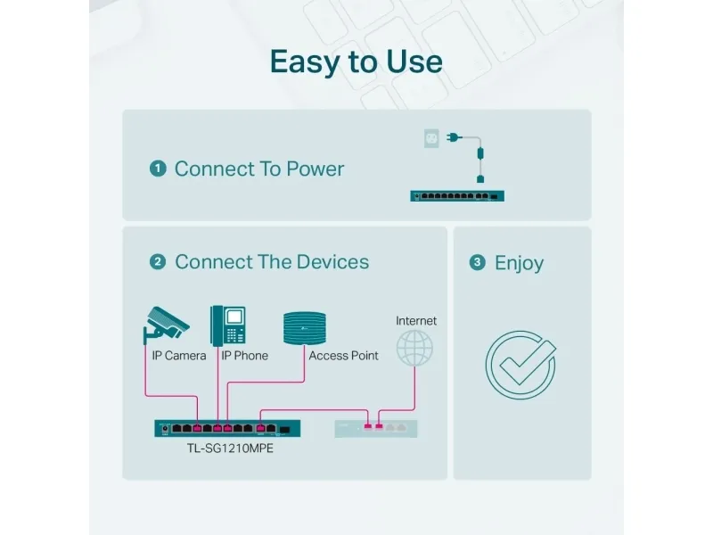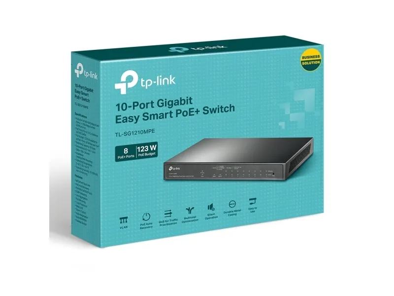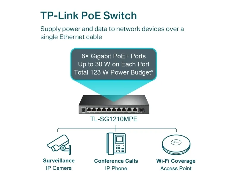 What This Product Does TP-Link TL-SG1210MPE is an easy smart switch with 9× gigabit RJ45 ports and 1× gigabit combo SFP/RJ45 port that requires no configuration. With 8× PoE (Power over Ethernet) ports, it can automatically detect and supply power with all IEEE 802.3af/at compliant Powered Devices (PDs). In this situation, the electrical power is transmitted along with data in one single cable allowing you to expand your network to where there are no power lines or outlets, where you wish to fix devices such as APs, IP Cameras or IP Phones, etc.