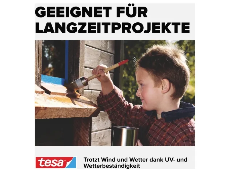 tesa® Masking Tape PRECISION OUTDOOR is a sustainable masking tape especially equipped for outdoor painting. It offers a solvent-free adhesive coating. Made from extra thin blue recycling paper, this high-performance tape takes care of precise paint edges. It offers reliable adhesion and allows residue-free removal, making it a weather resistant and UV resistant masking tape perfectly suited for any kind of outdoor renovation work.