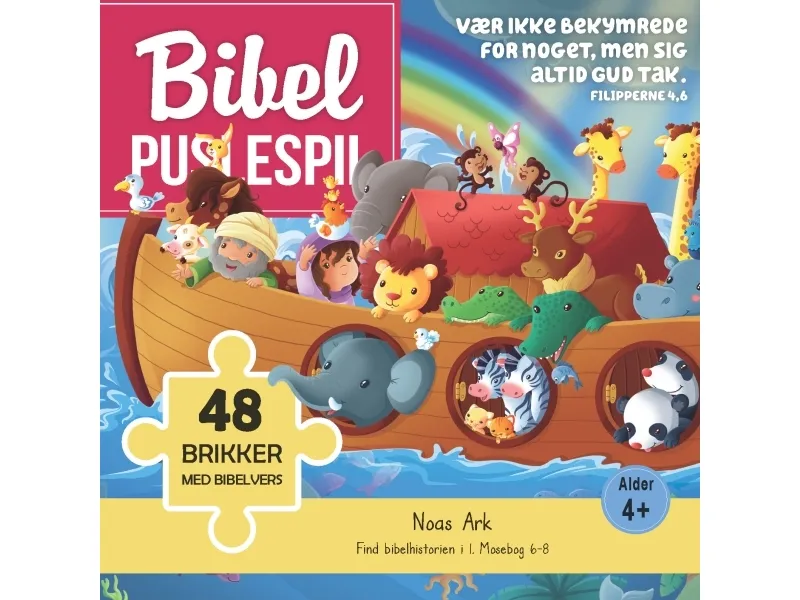Puslespil er tilbage i stor stil. At lære bibelvers, mens du laver puslespil, er en fantastisk måde at bruge lidt tid på. Noas Ark har 48 brikker.