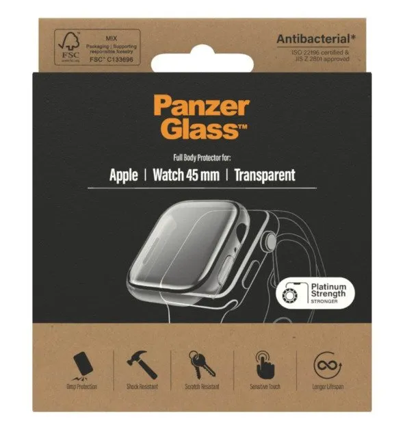 Protect your watch from the hazards of everyday life with PanzerGlass . Accidental bumps against handrails, elevator doors or table corners are no match for this scratch and shock-resistant screen protector glass. It even keeps your watch safe if you knock it down from your nightstand or bathroom sink onto a stone-hard floor. As an added bonus, the smudge-free coating with antibacterial effect kills up to 99.99% of all common surface bacteria and reduces traces of fingerprints and dirt. The screen protector glass is easy to install – just click it on and off as you like – and once installed, you'll never again fear the screeching sound of glass against metal. This may never happen, but if it does, you'll regret not having clicked "add to cart".The full-body glass covers the entire front as well as the curved sides of your watch, while still providing easy access to all button controls. It comes in FSC-labelled packaging that can be recycled.