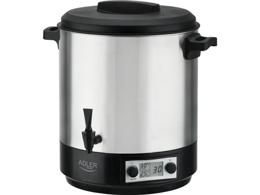 Gryten vi tilbyr er perfekt til pasteurisering, men også til oppvarming av drikke og retter (supper eller sauser). Beholderens kapasitet på opptil 28 liter gjør at vi kan sette mange mellomstore glass i den på en gang. Jevn temperaturregulering fra 30 til 100 °C, varmholdingsfunksjon, timer og LCD-skjerm gir rask og intuitiv betjening av utstyret. Ved å se på displayet kan du følge med på oppvarmingsprosessen og se hvor lang tid det er igjen til pasteuriseringen er fullført. Et stativ til å plassere glassene i bunnen er en måte å forhindre at de går i stykker. Takket være de komfortable og solide bærehåndtakene og den lange strømledningen kan gryten plasseres hvor som helst. Huset i rustfritt stål garanterer lang holdbarhet, og det avtakbare lokket sikrer rask innsetting og fjerning av produkter.