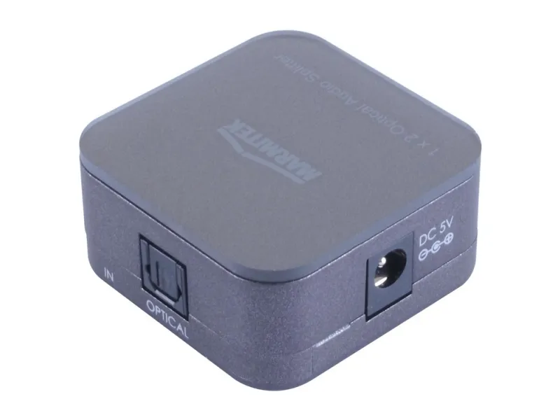 The Vogel's Marmitek Split TS12 audio splitter enhances audio experience with sound support. It features two TOSLINK inputs and one TOSLINK output, facilitating connection between audio devices. Compatible with DTS Digital Surround 5.1 and Dolby Digital, the Split TS12 ensures an immersive audio experience for home entertainment. With a power voltage of 5 V, it operates efficiently within a range of 0°C to 40°C while handling humidity levels of 10 to 85%. This desktop form factor is a convenient addition to any audio setup, allowing for reliable performance.