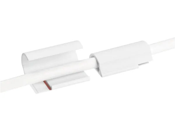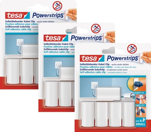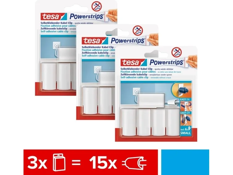 Kabel-clips Hvis du vil bringe orden i ledningskaos, er den selvklæbende tesa Powerstrips® kabelclips den optimale løsning. Den kan nemt monteres og efter brug fjernes igen uden problemer og uden at efterlade rester. I modsætning til almindelige kabelspændebånd fastgøres med søm, forårsager den smarte limløsning på traditionsmærket tesa® ikke skader underlaget. Med den eksklusive kabelclips kan du fastgøre kablet sikkert op til en diameter på 8 millimeter. Clippen egner sig til anvendelse i hjemmet eller på kontoret. Powerstrips'en er i øvrigt ikke synlig, da det skjules helt af kabelclipsen. For at clipsen kan opnå sin maksimale holdekraft, bør du først rengøre det område grundigt, som du har beregnet for den. Fjern derefter beskyttelsesfolien fra klæbefladen, og tryk Powerstrips'ene fast i mindst fem sekunder. Derefter skal du fjerne den anden folie og trykke på kabelclipsen - igen fem sekunder - fast på klæbebåndet. Undgå kontakt med allerede åbne klæbeflader, da dette kan påvirke klæbeevnen.
