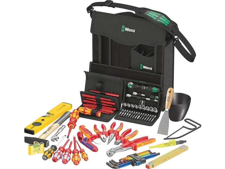 1 x Wera 2go 2;1 x 8100 SA 6;1 x 950/9 Hex-Plus Multicolour HF 1;1 x Kraftform Kompakt Turbo i 1;1 x 932 A;1 x 3162 i VDE;1 x 3165 i PZ VDE;1 x 160 i VDE;1 x 160 iS;1 x 6004 Joker S;1 x KNIPEX® Kombizange 160 mm 01 06 160;1 x KNIPEX® Abisolier-Seitenschneider 14 26 160;1 x KNIPEX Flachrundzange mit Schneide (Storchschnabelzange) 26 16 200;1 x KNIPEX® Cobra® VDE Hightech Wasserpumpenzange, isoliert, 87 26 250;1 x KNIPEX® Kabelmesser 98 52;1 x KNIPEX® ErgoStrip® Universal-Abmantelungswerkzeug 16 95 01;1 x PUK® 2200 Kleinsägebogen;1 x Lyra® Tiefloch-Markierer 4494202;1 x STABILA® Wasserwaage Pocket Electric 17775;1 x STABILA® Wasserwaage Type 70, 30 cm, 02281;1 x STABILA® Holz-Gliedermaßstab Type 607, 2 m, hellgelb, 01104;1 x PICARD® Schlosserhammer 400 g, Deutsche Form, 000101-0400;1 x Jung Gipsbecher, 127 mm, 946 127 00;1 x Jung Malerspachtel mit Naturholzheft, 922 050 00