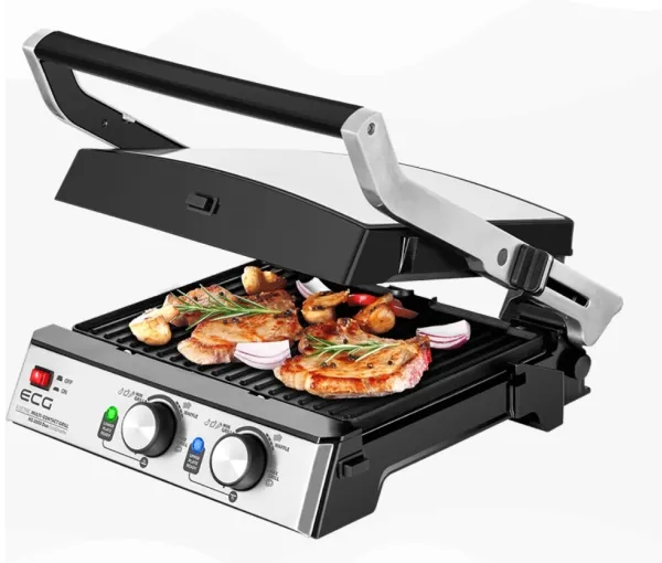 ECG KG 2033. Product colour: Stainless steel, Housing material: Stainless steel, Form factor: Rectangular. Power: 2000 W, AC input voltage: 220 - 240 V, AC input frequency: 50 - 60 Hz. Width: 365 mm, Depth: 355 mm, Height: 140 mm. Package width: 422 mm, Package depth: 380 mm, Package height: 185 mm