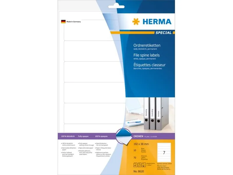 Product details - File spine labels on A4 sheets, self-adhesive - For a uniform appearance at the office and at home - For all standard files - Fully opaque material with high whiteness, old lettering does not show through - Blank: ideal for company logos, inscriptions and organization notes - Reliable adhesion, even with frequently used files - Environmentally friendly: high-quality, chlorine-free bleached special paper, PEFC-certified, solvent-free adhesive - Labels are 100% recyclable, dispose of as for waste paper, packaging made from recycled cardboard - Excellent printing results on all laser printers, inkjet printers, copiers, colour laser printers and colour copiers - Trouble-free processing thanks to all-round protective edge and optimum flatness - Free software solutions