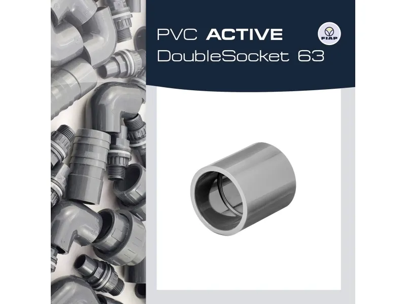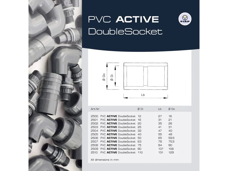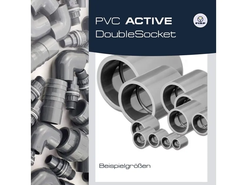 Med PVC-dobbeltmuffen kan forbindelser inden for rørlægningen af dam-, filter- og bassinanlæg realiseres. For en optimal forbindelse skal de førsteklasses PVC-fittings inden påføringen rengøres med FIAP PVC-rengøringsmiddel.