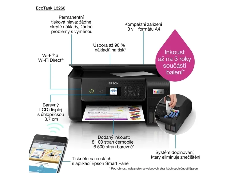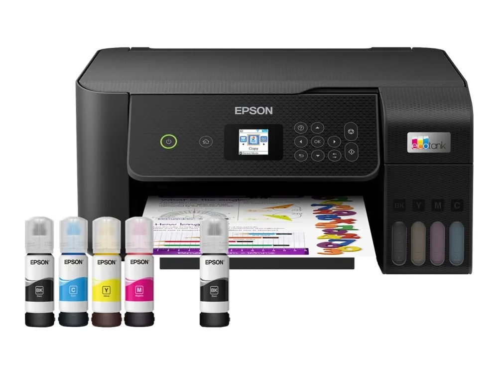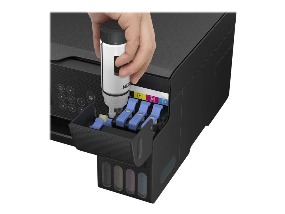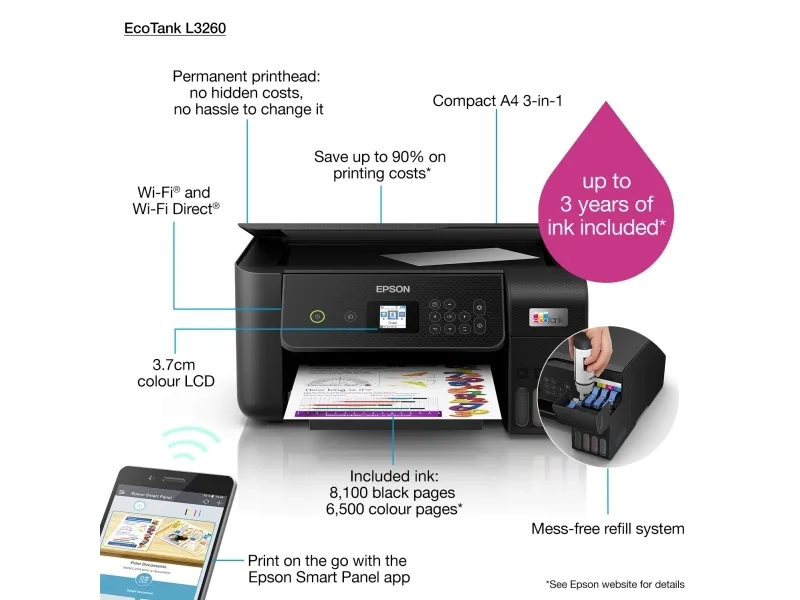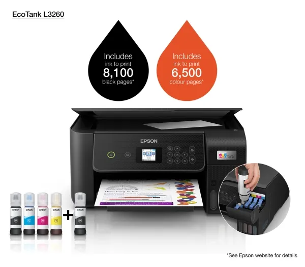 Save up to 90% on printing costs with Epson's cartridge-free EcoTank printers. Supplied with high yield ink bottles, the integrated ink tanks are easy to fill thanks to the specially engineered ink bottles. With no cartridges to replace, flexible connectivity features and an LCD screen, this is the perfect printer for anyone looking for high-quality prints at an incredibly low cost per page.