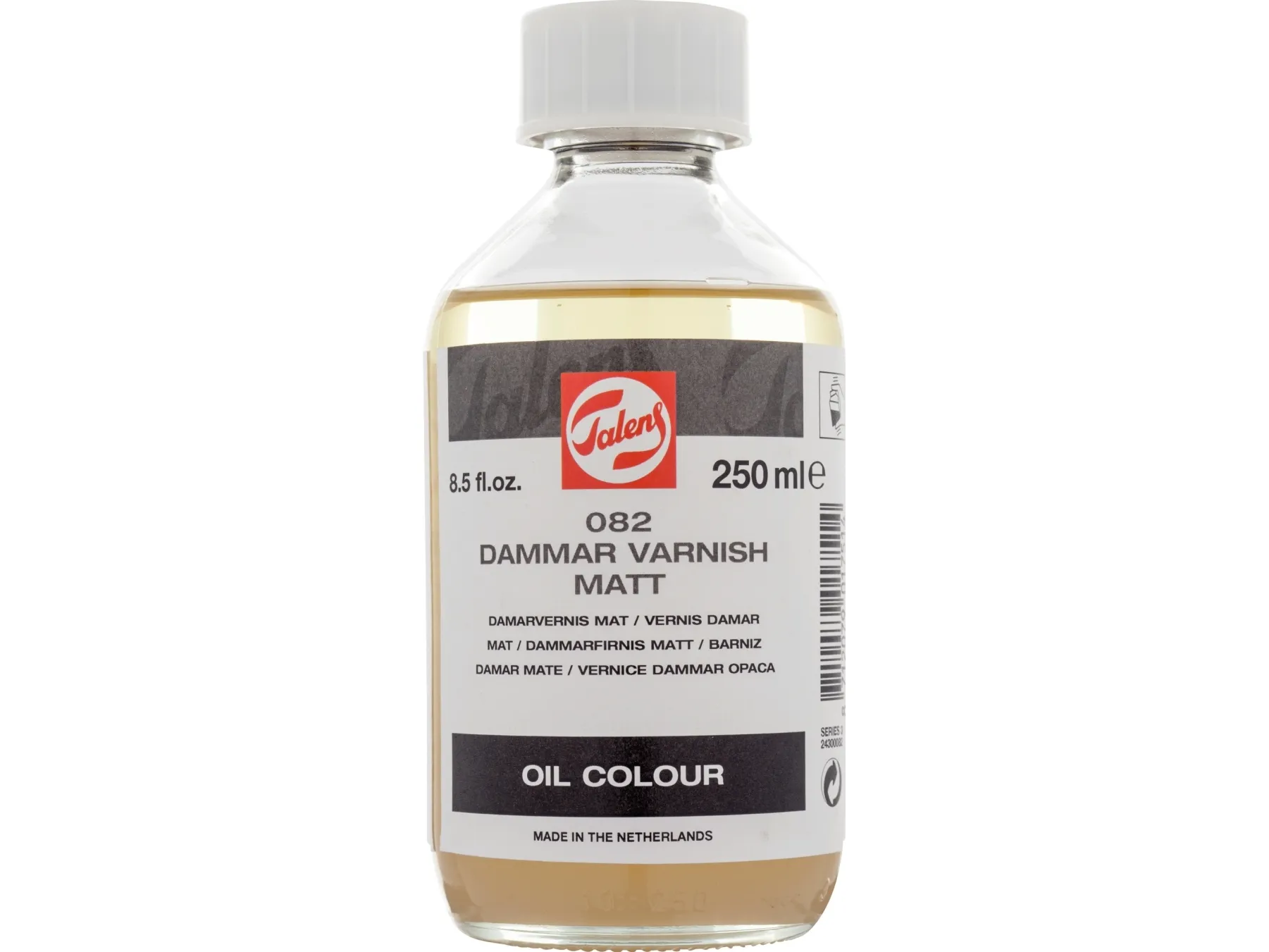 Purpose: Protecting an oil painting. Composition: Dammar resin, turpentine oil, matting agents (wax and silica) • Traditional final varnish • Apply when paint film has completely dried (approx. 1 year with normal layer thickness) • Dries in a few hours • May show signs of ageing after some time such as yellowing and crackling • Gives a satin gloss • Apply in one layer and in one direction • Mixing with Dammar varnish glossy 081 increases the degree of gloss • Can be thinned with turpentine, clean brushes with turpentine or white spirit • Dry varnish coats can be removed with turpentine • Shake well before use • Highly flammable
