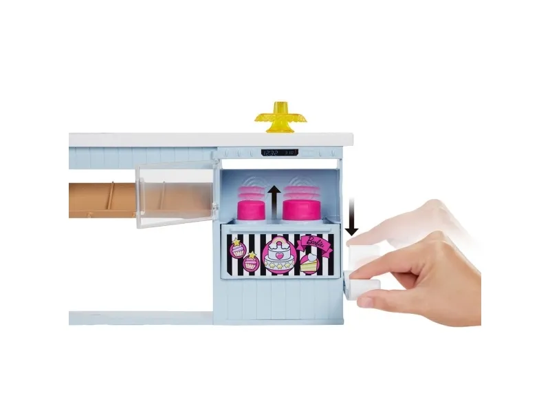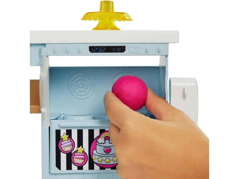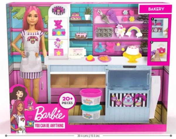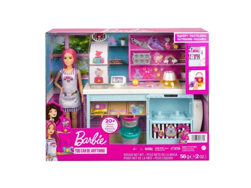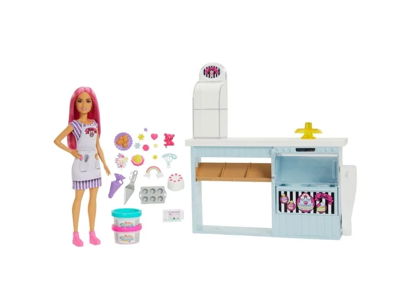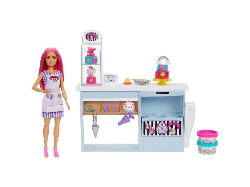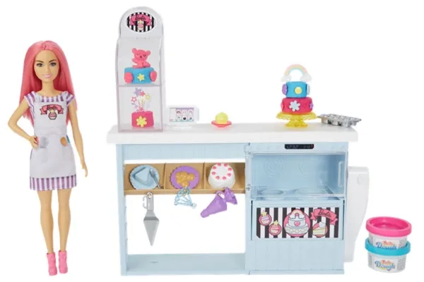 Utforsk hvordan man driver eget bakeri med Barbie Bakery-lekesettet. Barn elsker bakte godsaker og med dette lekesettet kan de drive eget bakeri og lage deilige kaker og andre søtsaker! Lekesettet inneholder en Barbie Bakery-dukke i smal størrelse (30 cm), med trendy rosa hår og en søt stripet kjole med forkle. Bakeområdet har tre lekeområder hvor barna kan bake, pynte og stille ut kakene sine, samt over 20 tilbehørsdeler som inspirerer til historiefortellinger. Barn kan bruke to ulike farger av deig (rosa og blå), putte den i ovnen, dra i spaken og se kaken heve seg for ekstra moro! Deretter kan de pynte kaken på kakeholderen og bruke ulike dekorasjoner og pynt til å lage sin egen stil på kaken. Lekesettet inneholder bakeområde, Barbie-dukke på 30 cm, 2 deigbeholdere, kakepyntstempel, stekespade, dekorasjoner, pynt, cupcake-form, fat med småkaker og mer. Barbie-dukke kan holde noe av tilbehøret, for enda mer realistisk lek. Dukken kan ikke stå uten støtte. Farger og dekor kan variere. En flott gave for barn fra 3 år og opp.