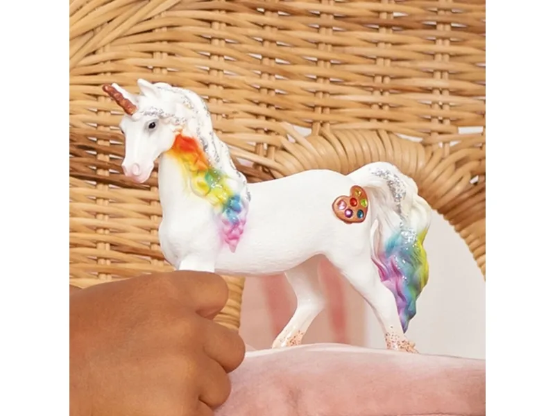 Our rainbow unicorn mare from the Schleich BAYALA world has a heart for hiking. With her rainbow tail, she brings color to any environment, whether mountains or bathrooms. By the way, the mare's horn starts to glow when she discovers something particularly beautiful. And their hooves leave glitter marks everywhere. That way it's never lost.