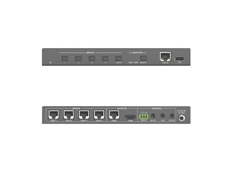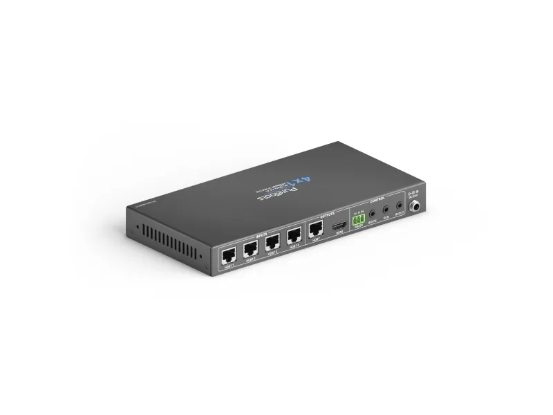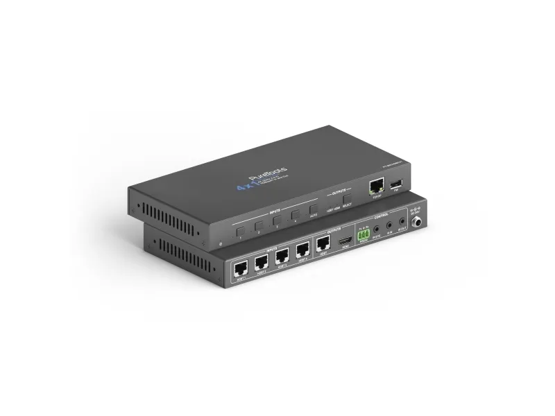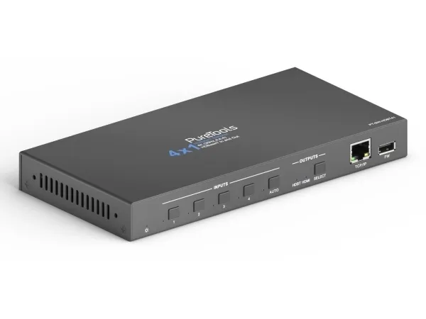 4x1 HDBaseT Switcher incl. Scaler\n\nPureTools - 4x HDBaseT to 1x HDMI Switcher (+Loop), 4K (60Hz 4:2:0), HDMI 2.0a, HDCP 2.2\n\nPureTools - Professional Media Technology for all Purposes\n\n- Transmission of 4K@60Hz (4:2:0) over 40m or FullHD / 1080p over 70m\n- Four HDBaseT inputs as well as mirrored HDBaseT and HDMI outputs\n- Seamless switching as well as up- and downscaling of 4K and 1080p signals\n- Ethernet pass-through to end points incl. full PoH support\n- Digital and analogue audio extraction\n- Control options via GUI, TCP/IP, RS232 and CEC\n- Accepts "switching" and "wake" commands from each TX\n\n- Transmission of 4K@60Hz (4:2:0) over 40m or FullHD / 1080p over 70m\n- Four HDBaseT inputs as well as mirrored HDBaseT and HDMI outputs\n- Seamless switching as well as up- and downscaling of 4K and 1080p signals\n- Ethernet pass-through to end points incl. full PoH support / Control options via GUI, TCP/IP, RS232 and CEC\n- Digital and analogue audio extraction / Accepts "switching" and “wake” commands from each TX
